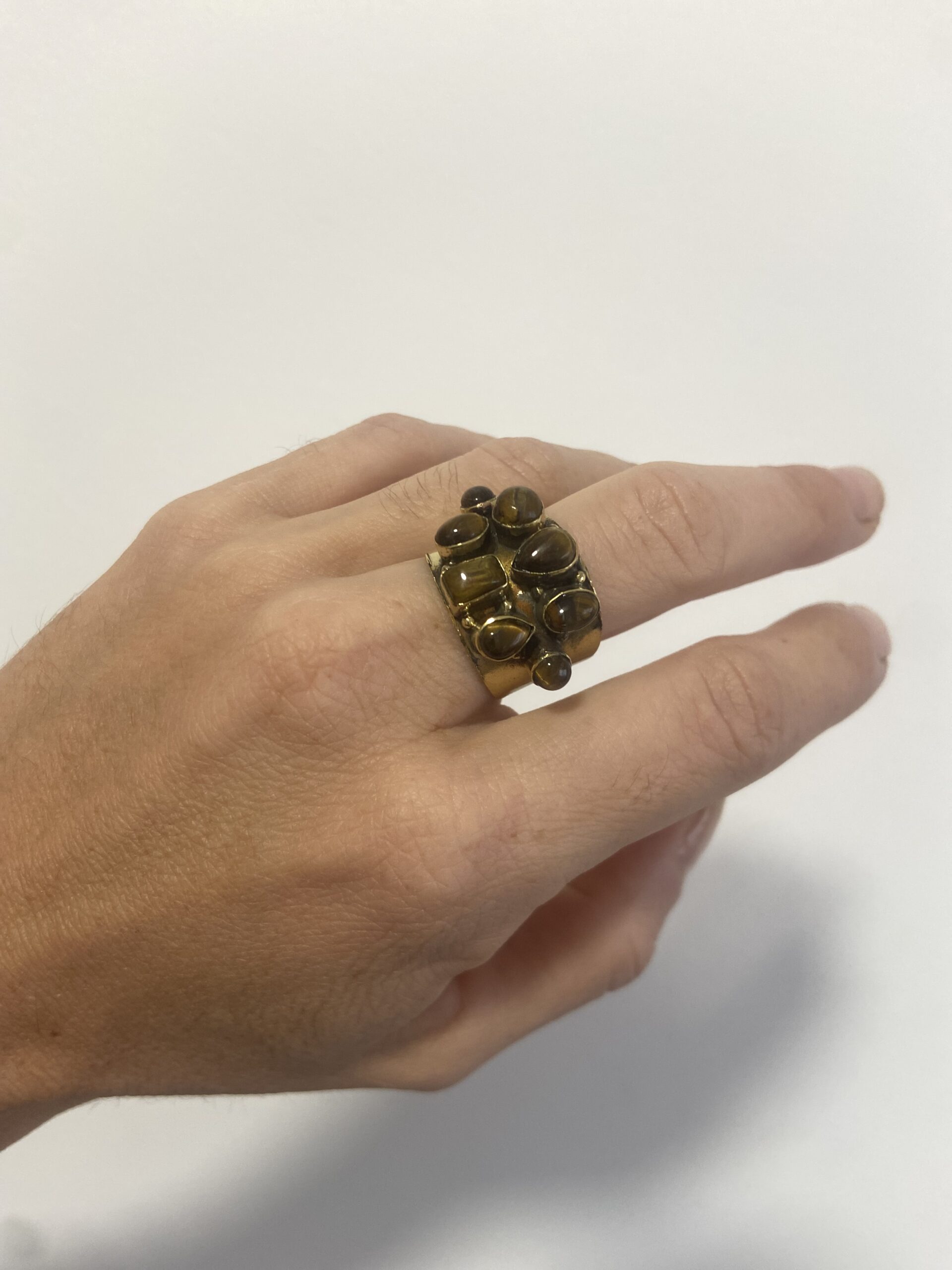 Anillos artesanales de latón creados en India, cada uno decorado con siete piedras naturales de alrededor de 5 mm, disponibles en versión Ojo de Tigre o multicolor. Tienen un diseño abierto y ajustable que se adapta a cualquier talla. Piezas únicas, con acabado envejecido y un estilo bohemio que combina tradición india y carácter auténtico.