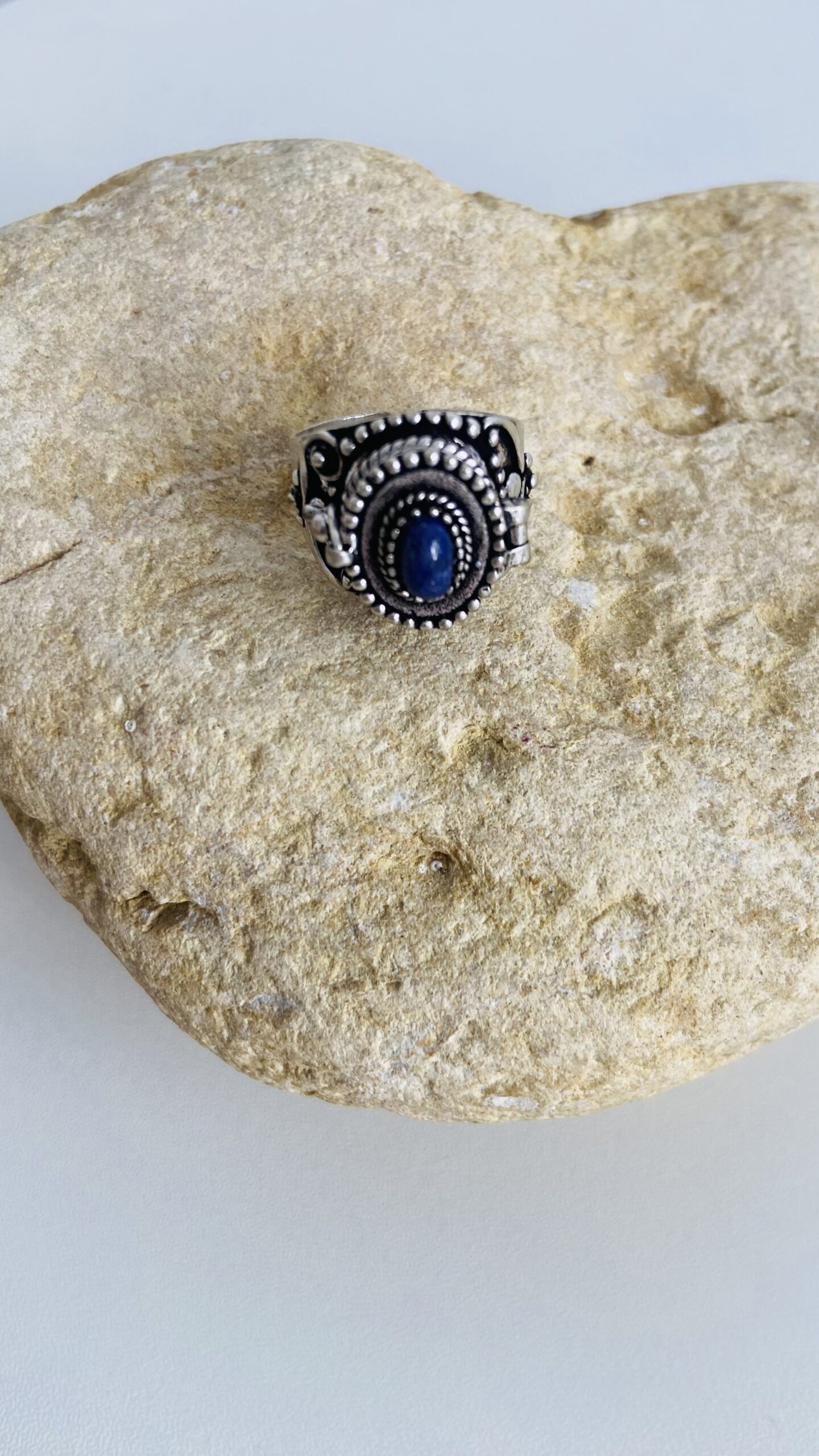 Anillo étnico con piedra azul en el centro. Baño de plata, hecho a mano en India. Un pequeño tesoro para los amantes del estilo boho.