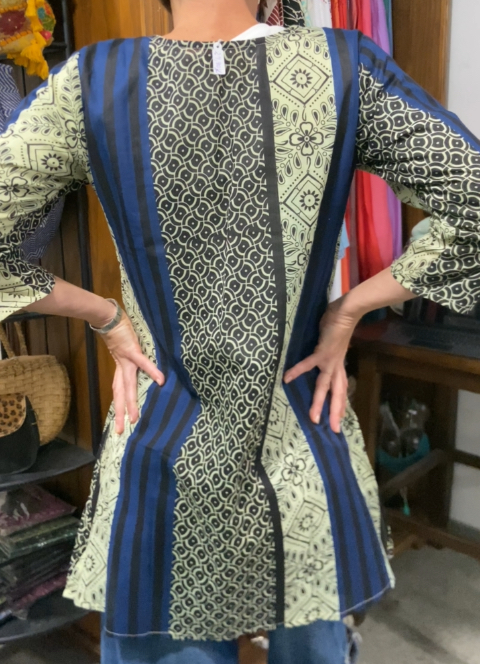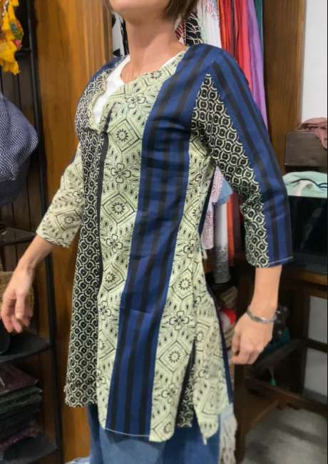 Blusa boho artigianale dell’India, chiusura al fronte con escote corto di 15 cm, manga larghi e aperture laterali. Disponibile in azzurro, nero e bianco. Talla ML (modello usa S/40, largo del busto 50 cm).