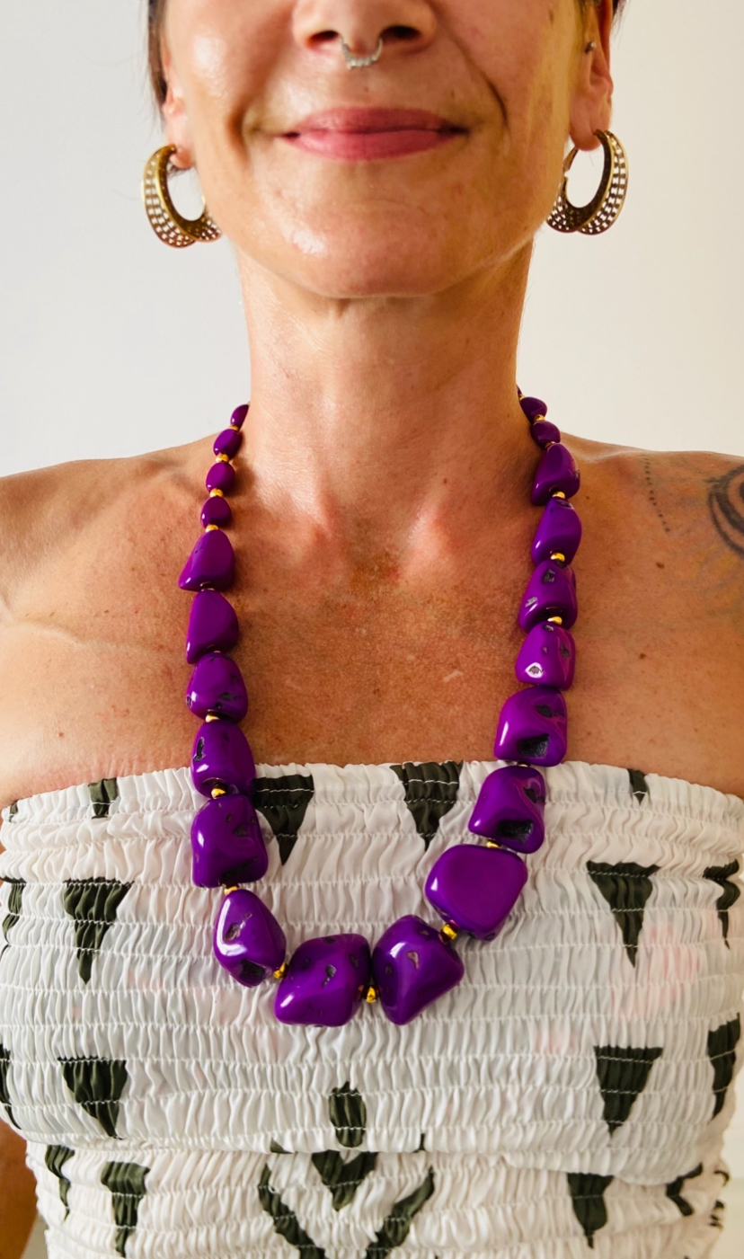 Collar con piedras que alcanzan 1,5 cm en el centro. Cierre de gancho fijo. Disponible en varios colores vivos. Artesanal y boho chic.