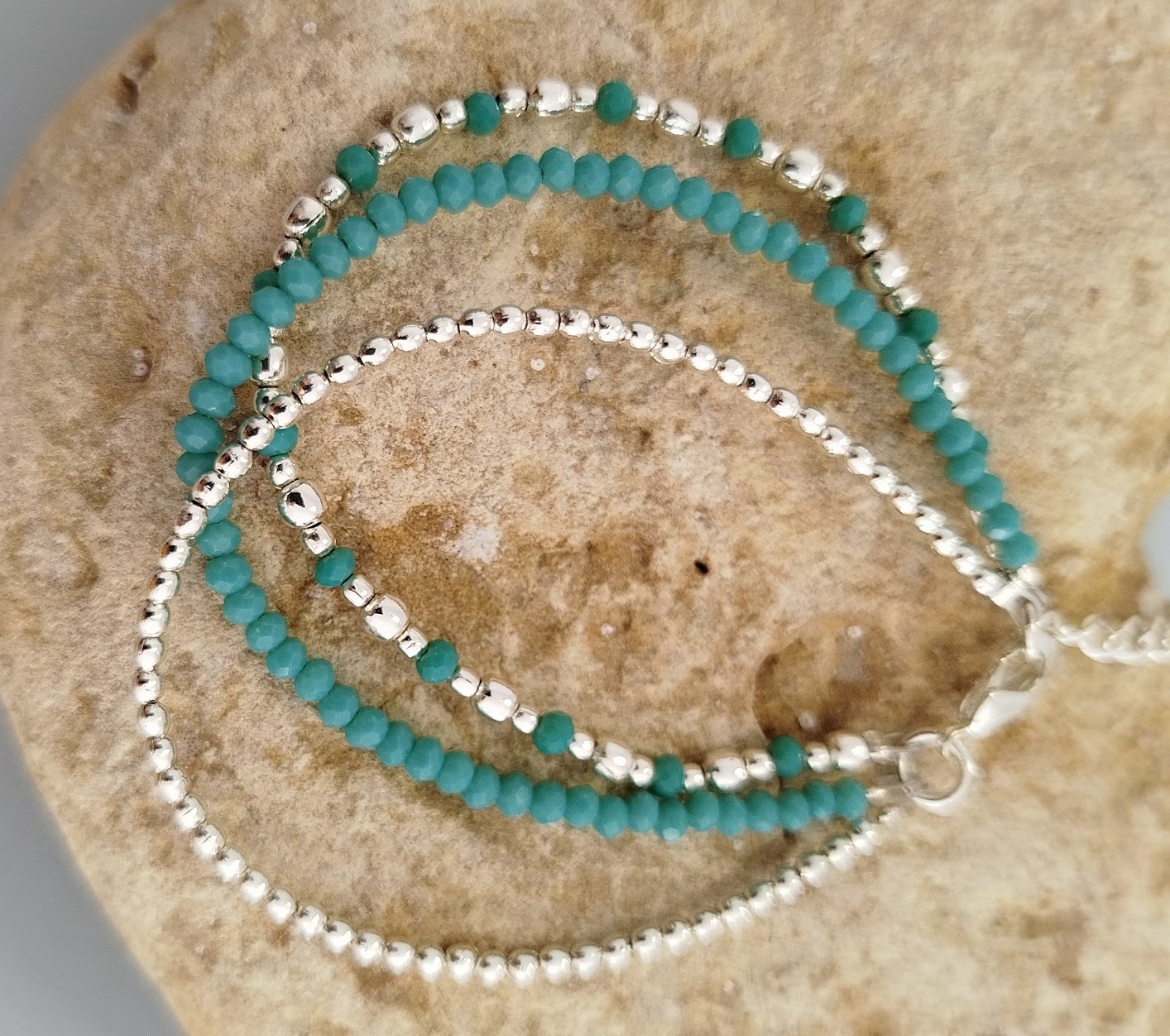 Esta pulsera presenta tres hileras de perlas: una hilera de perlas turquesa, una de perlas turquesa y plateadas y una de perlas plateadas, creando un diseño elegante y sofisticado que refleja una estética minimalista y brillante.