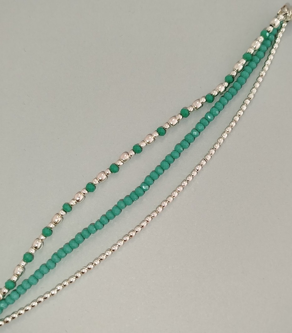 Descubre nuestra pulsera de tres hileras de perlas: una hilera de perlas turquesa, una de perlas turquesa y plateadas y una de perlas plateadas. Diseño minimalista y brillante con cierre ajustable..