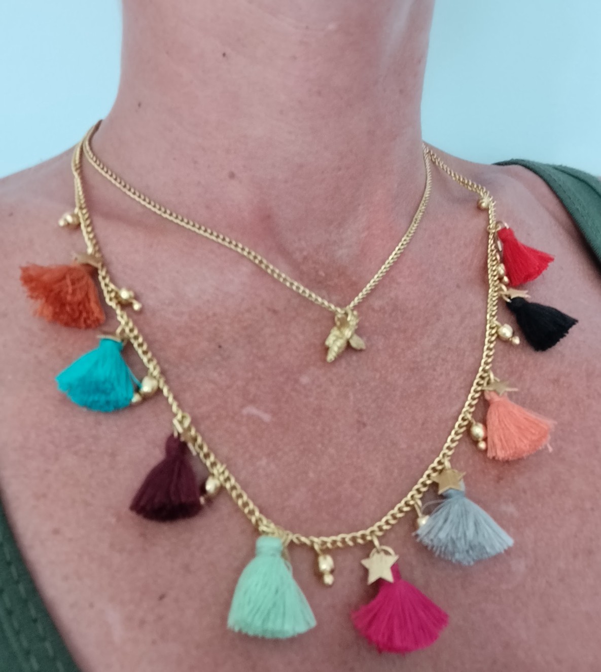 Descubre nuestros dobles collares artesanales indios, con borlas multicolores y un colgante en forma de mosca que le da un toque de originalidad al diseño.