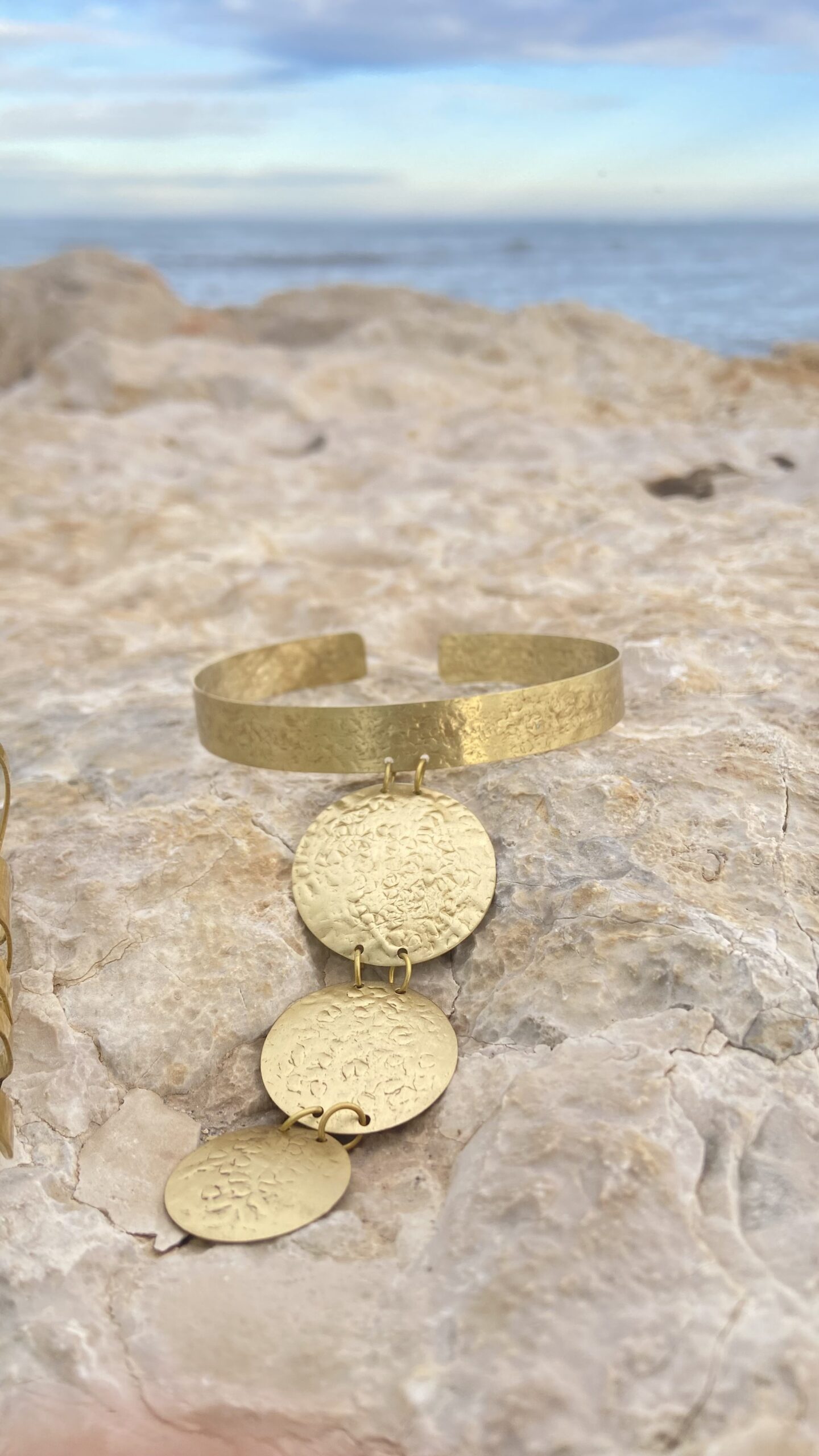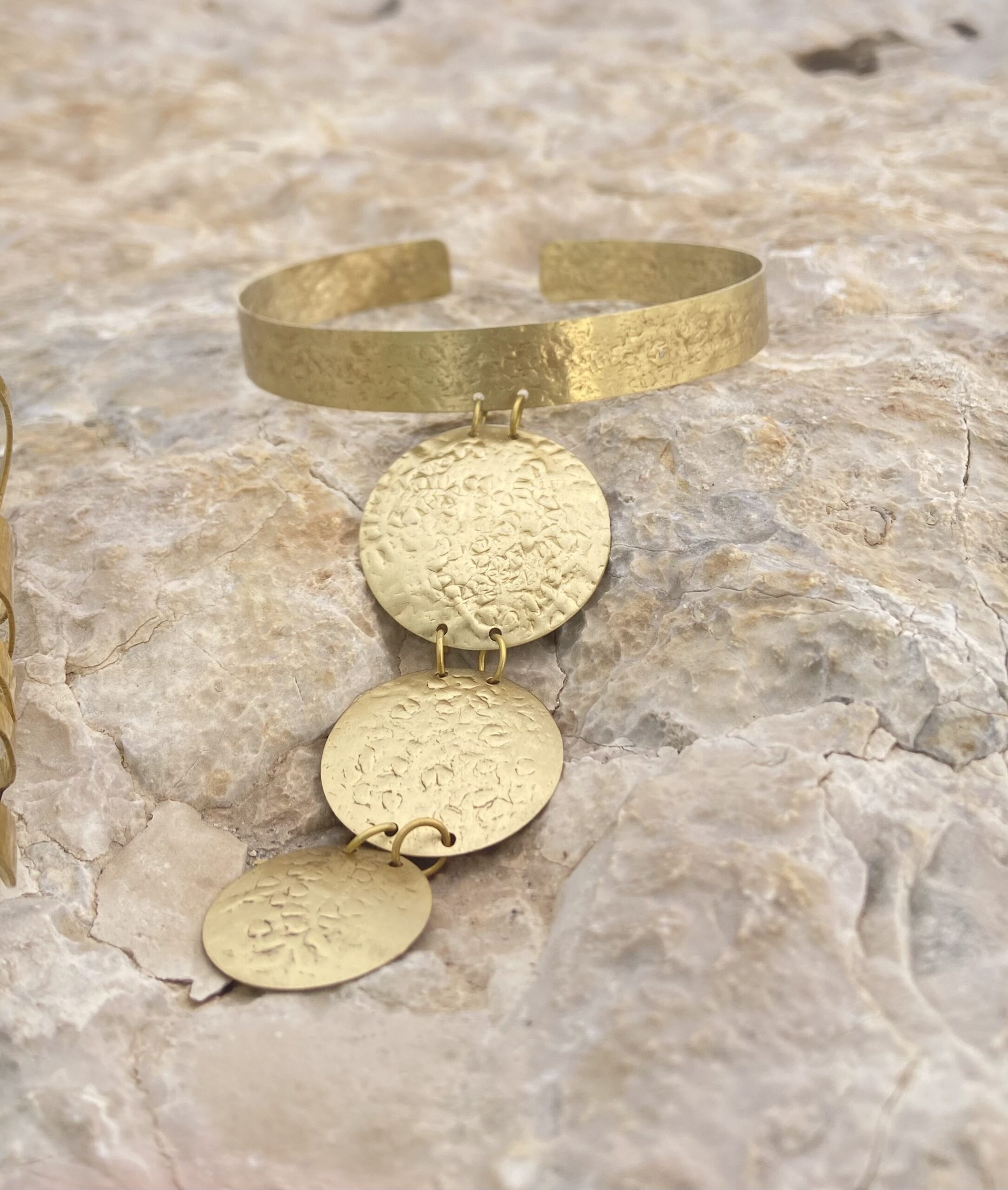 Collar rígido con tres aros colgantes en orden de tamaño. Una joya exclusiva para quienes buscan destacar con estilo.