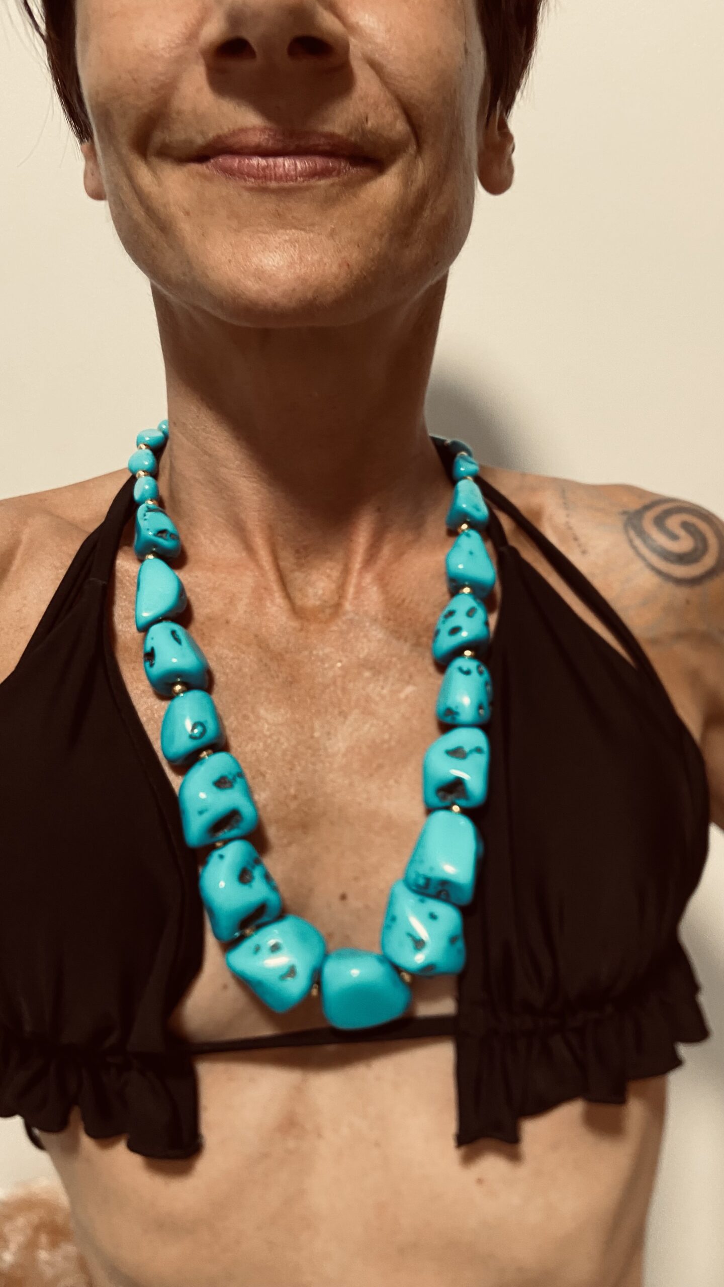 Collar hecho a mano con piedras naturales grandes y toques dorados. Ajustable con cadena. Disponible en verde y turquesa. Estilo boho elegante.