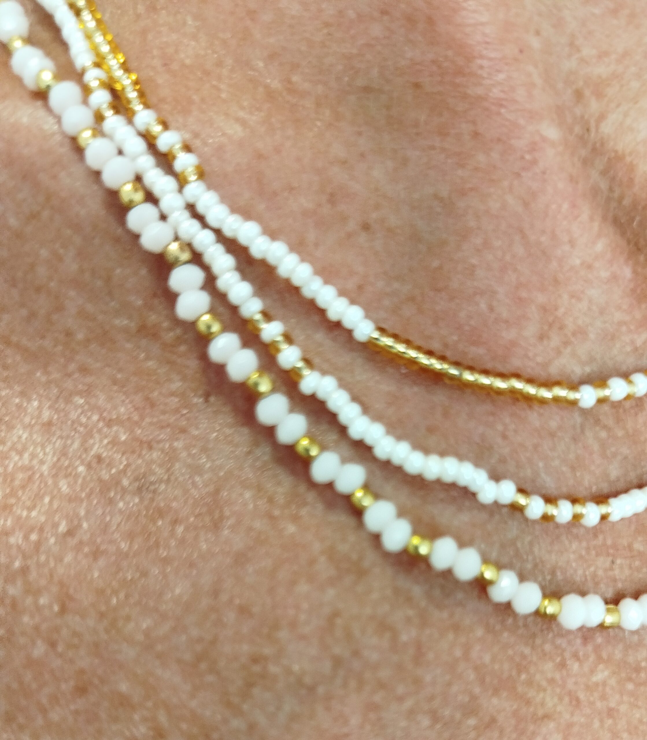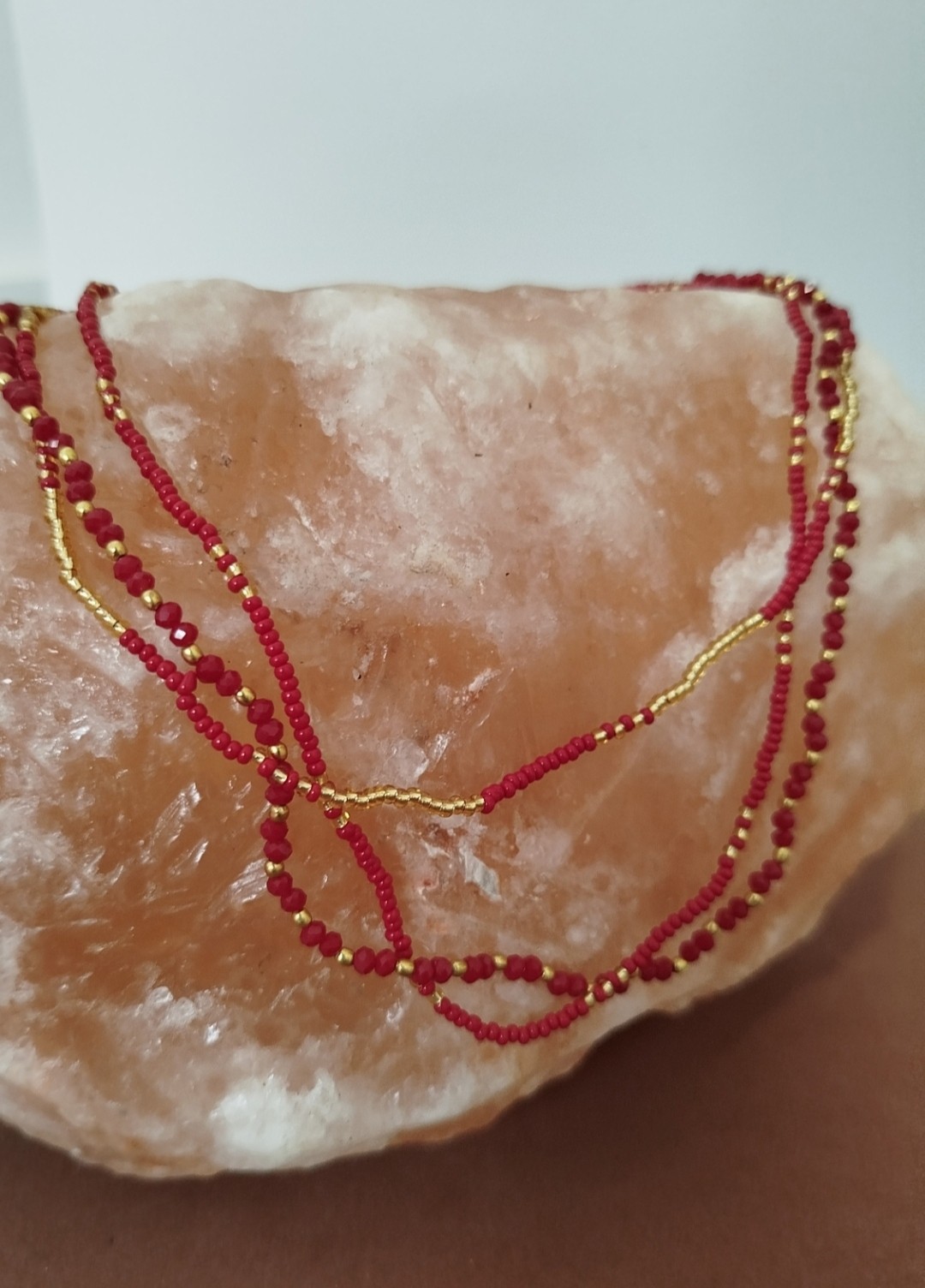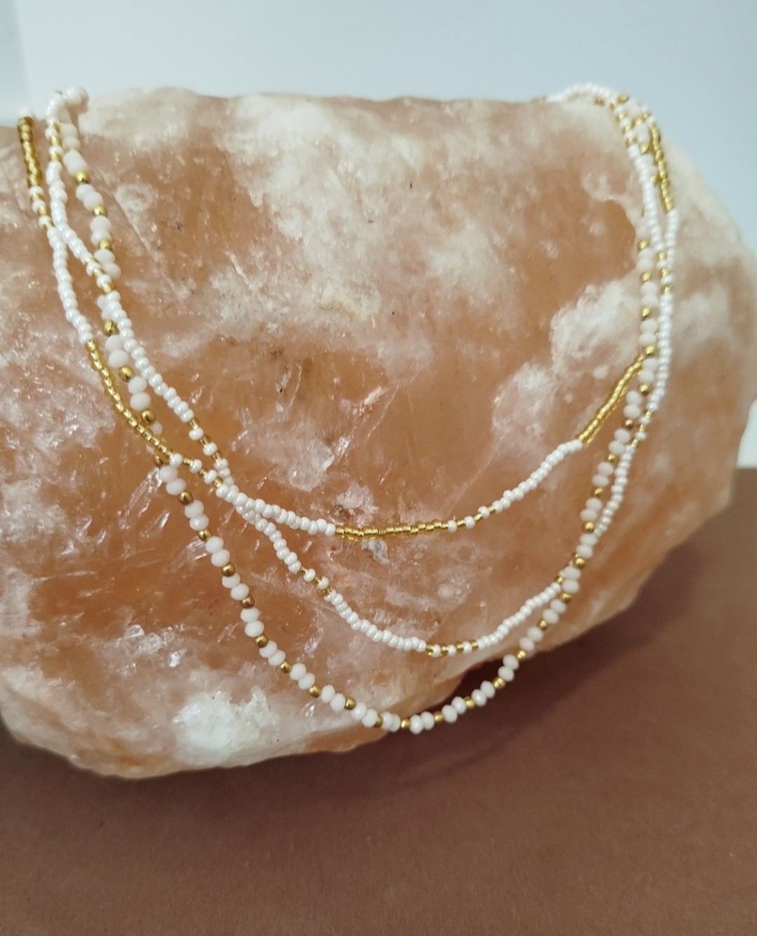 Elegante collar de tres hileras de cuentas con combinaciones de oro y colores vibrantes. Perfecto para un look en capas, con cierre ajustable para una comodidad personalizada. Disponible en negro, azul, rojo, turquesa y blanco con dorado.