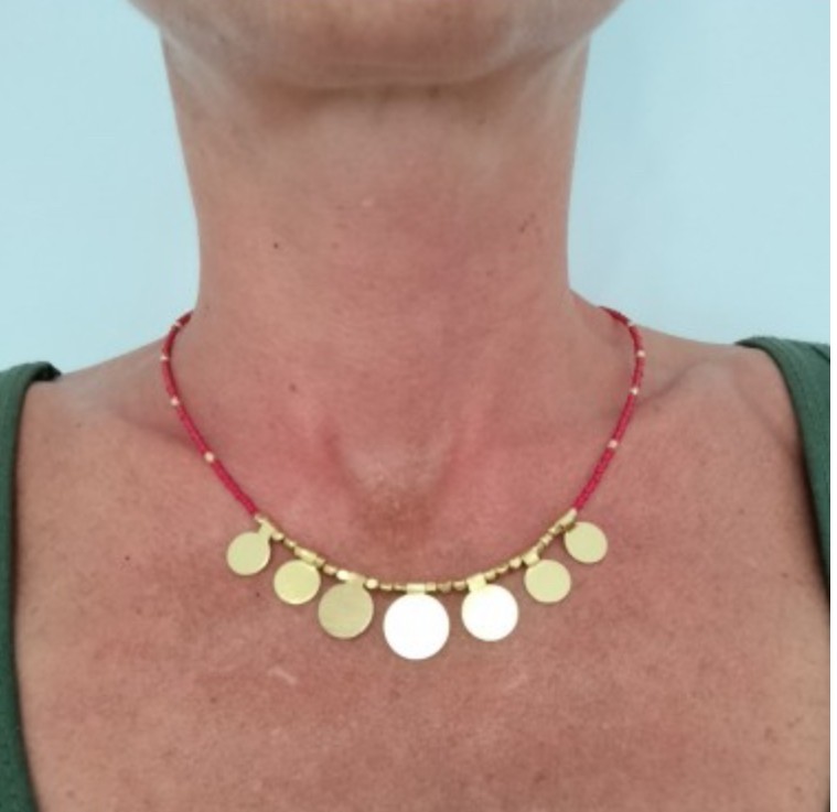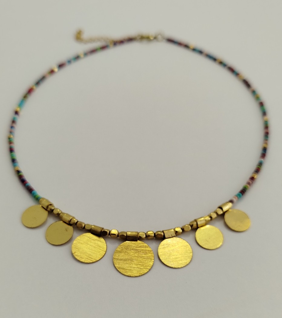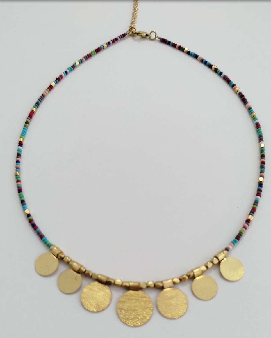 Collar con perlas multicolores y 7 colgantes redondos dorados, con cierre ajustable.