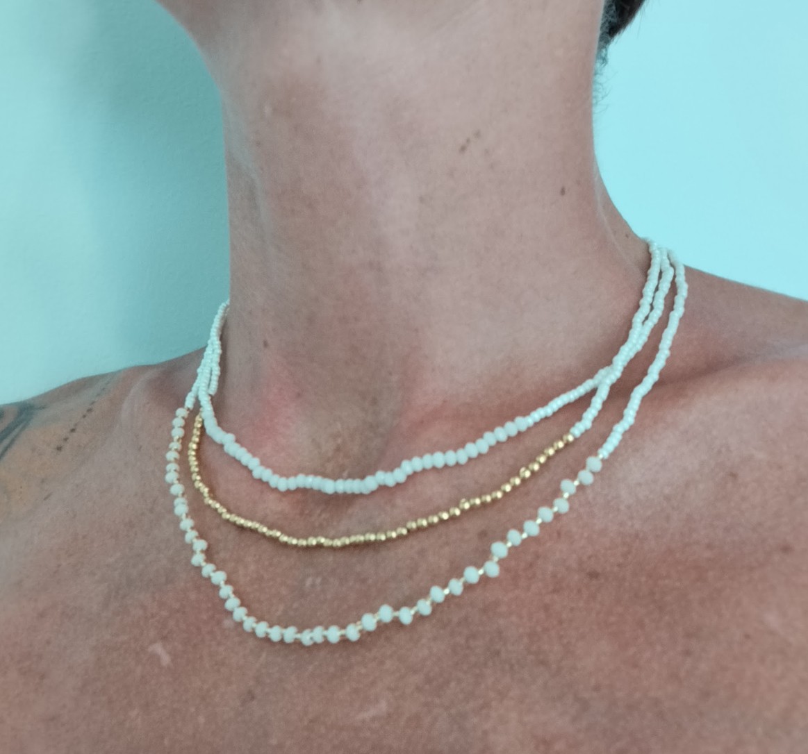 Collar de 3 hilos con perlas: uno de perlas de colores y dos con combinaciones de perlas blancas y doradas.