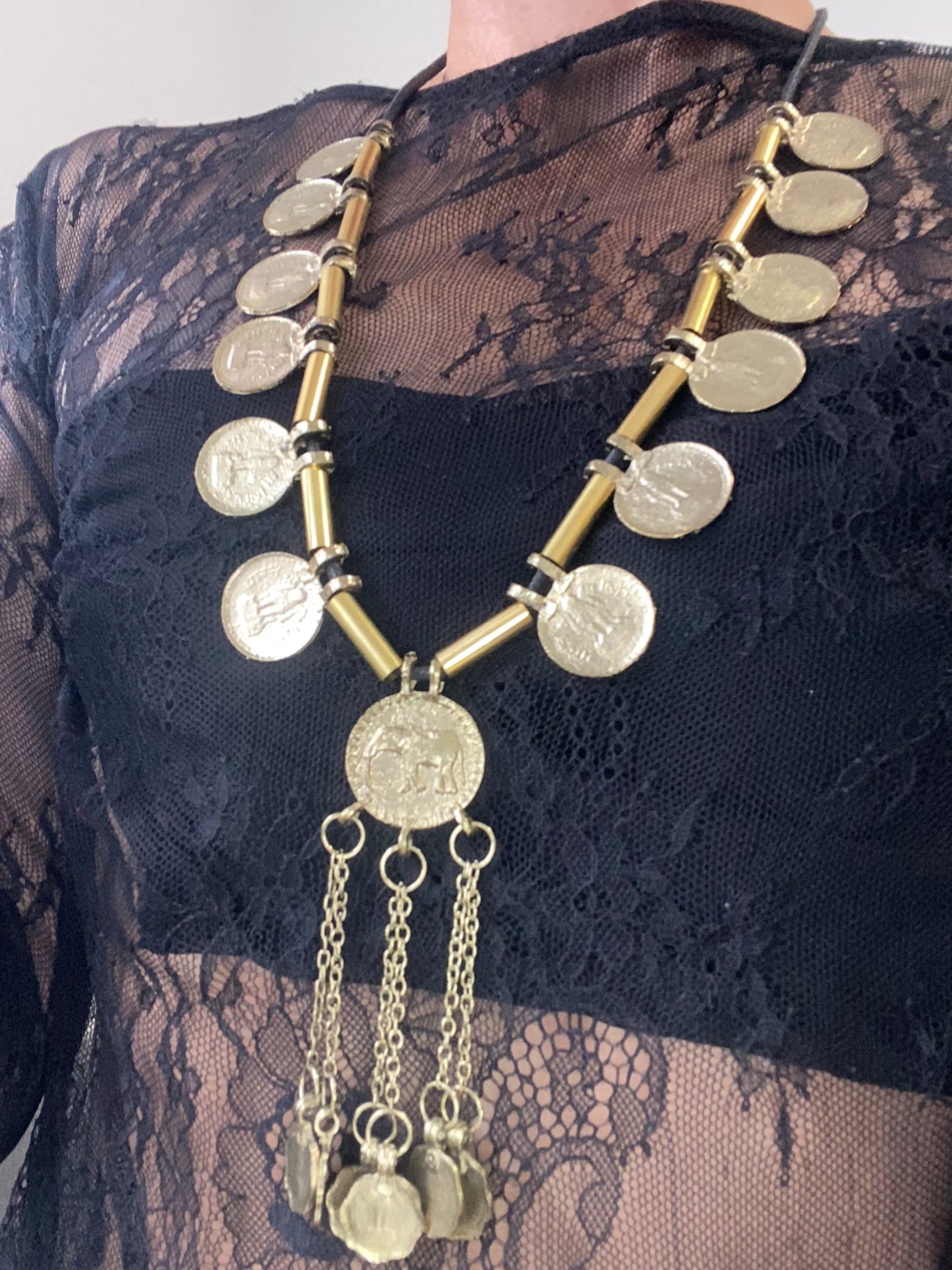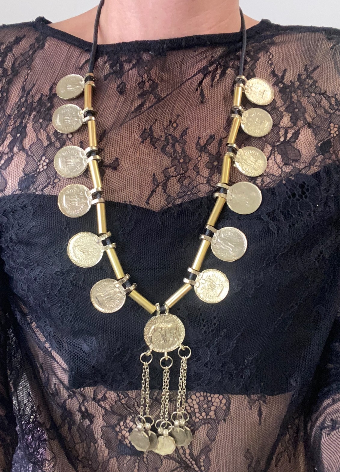 Este collar largo está elaborado con cuerda negra y decorado con medallones en color oro con monedas estampadas, creando un efecto visualmente atractivo.
