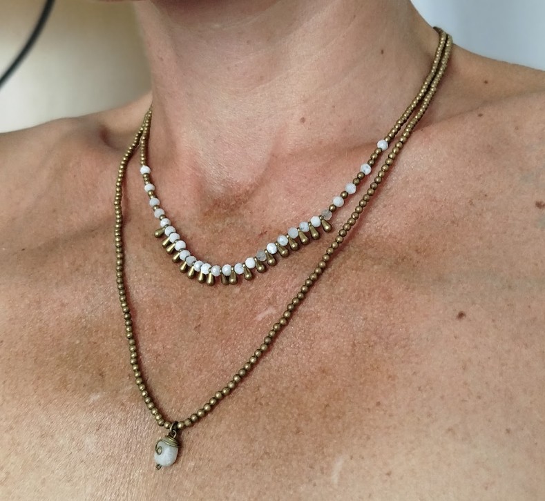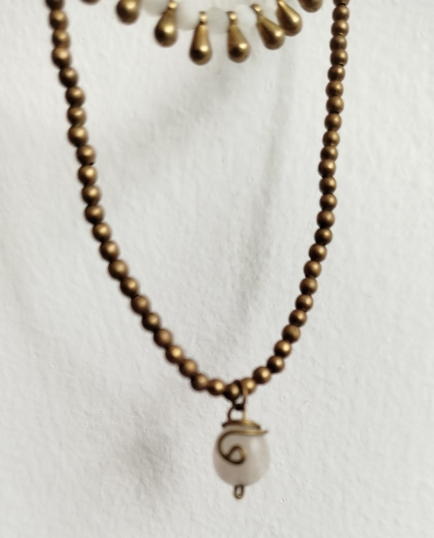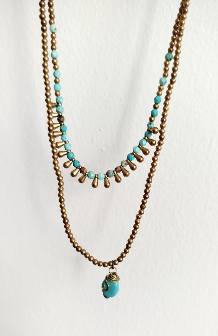 La primera fila, más ajustada al cuello, presenta una sofisticada alternancia de colores, mientras que la segunda fila, más larga, está compuesta por cuentas doradas y adornada con un colgante de piedra de mayor tamaño, que puede ser en color turquesa o blanco, según tu elección.
