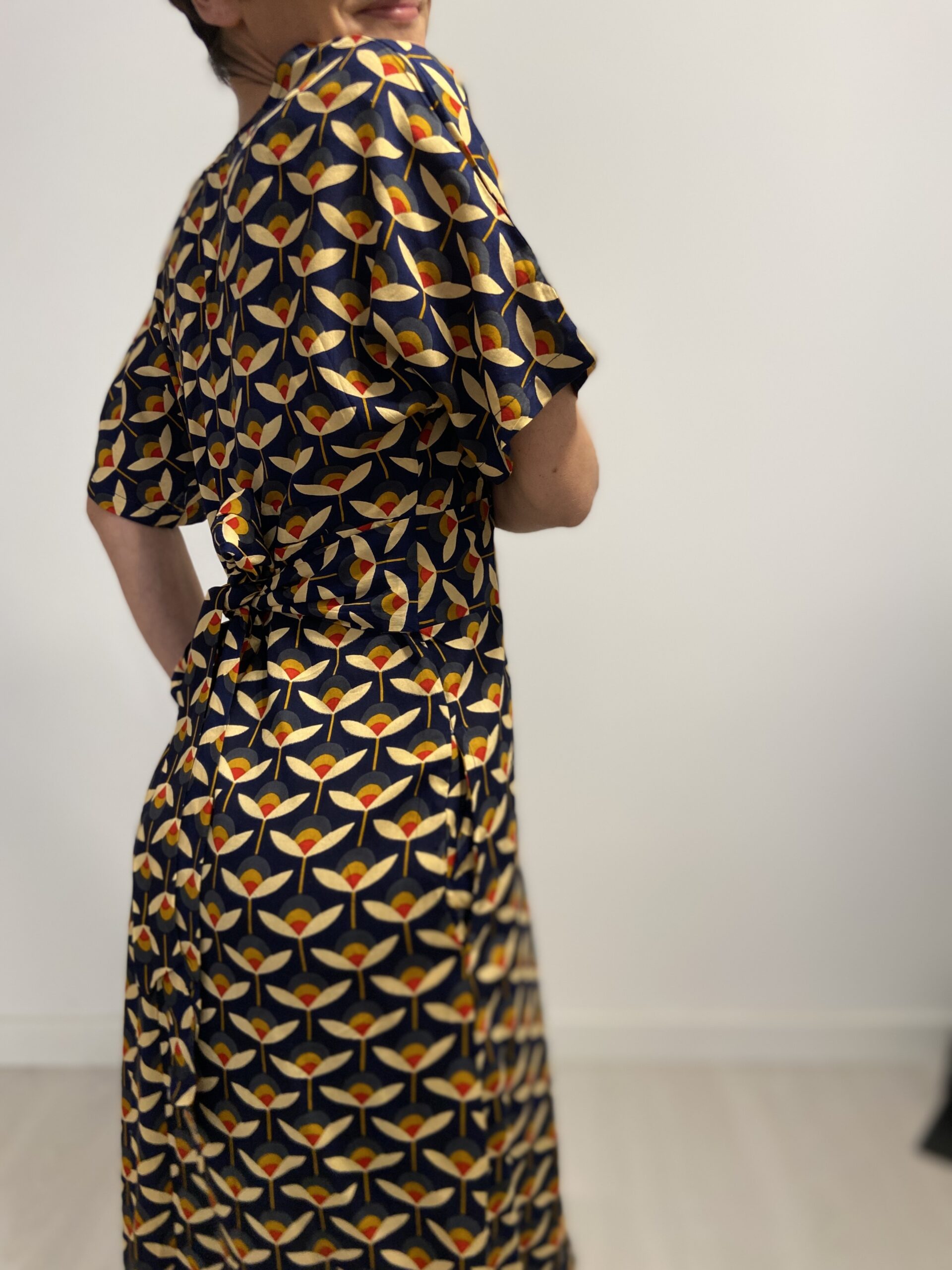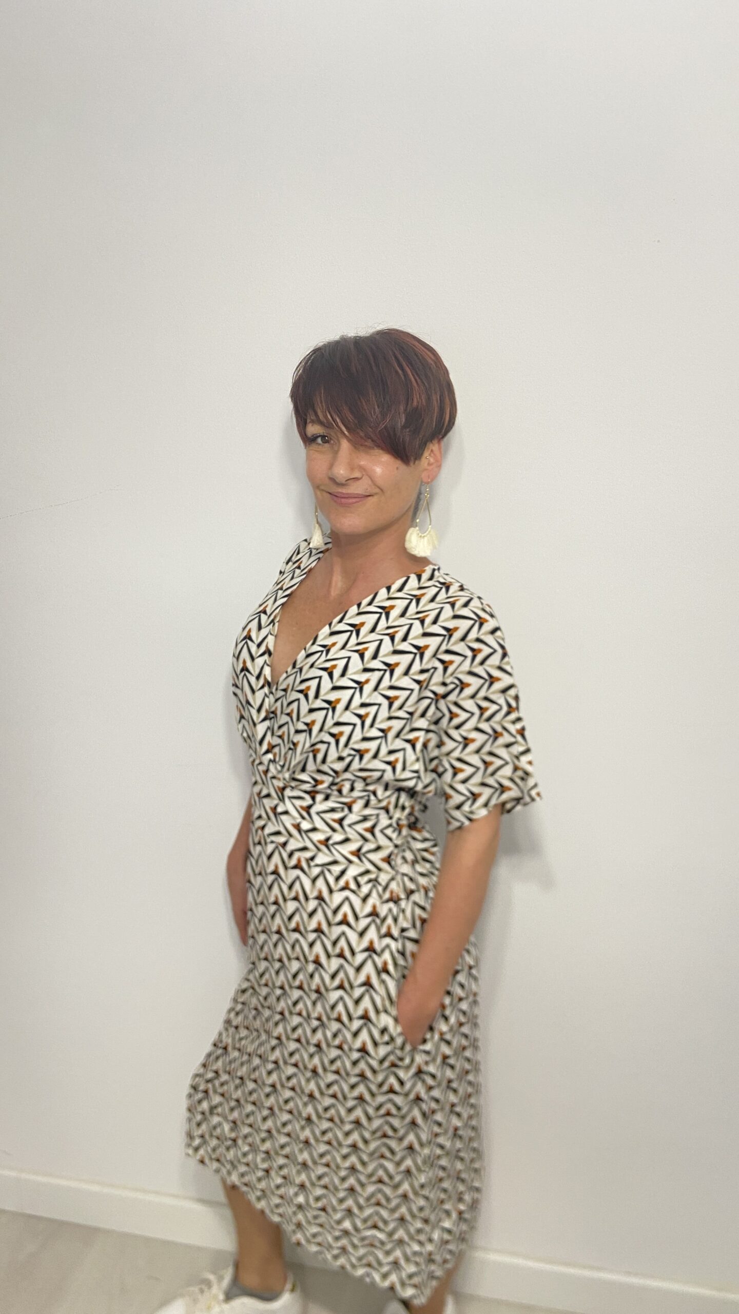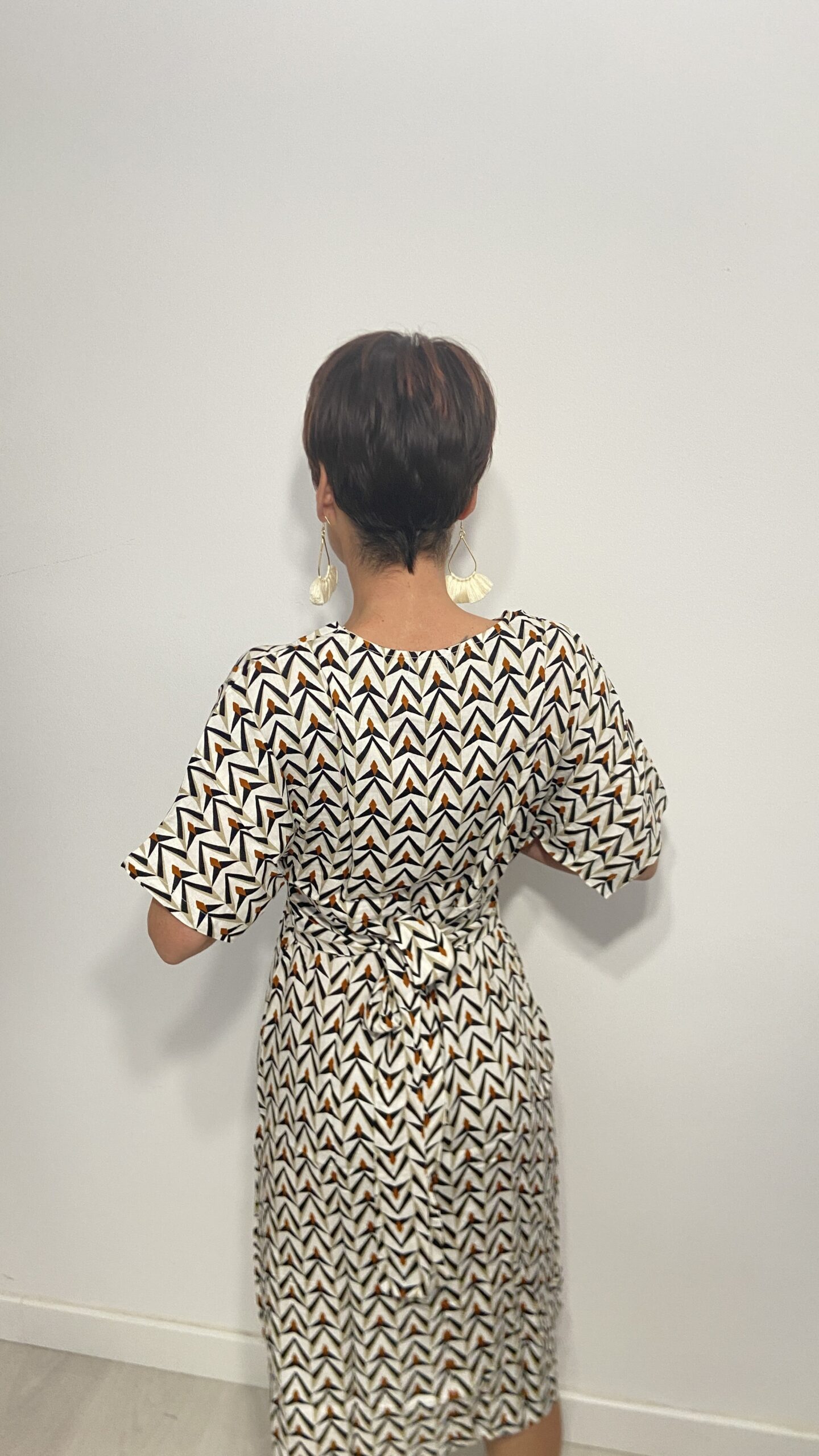 Un vestido de inspiración bohemia con un diseño envolvente, manga amplia y lazo ajustable en la espalda. Hecho de 100% rayón, es ligero, cómodo y perfecto para cualquier ocasión.