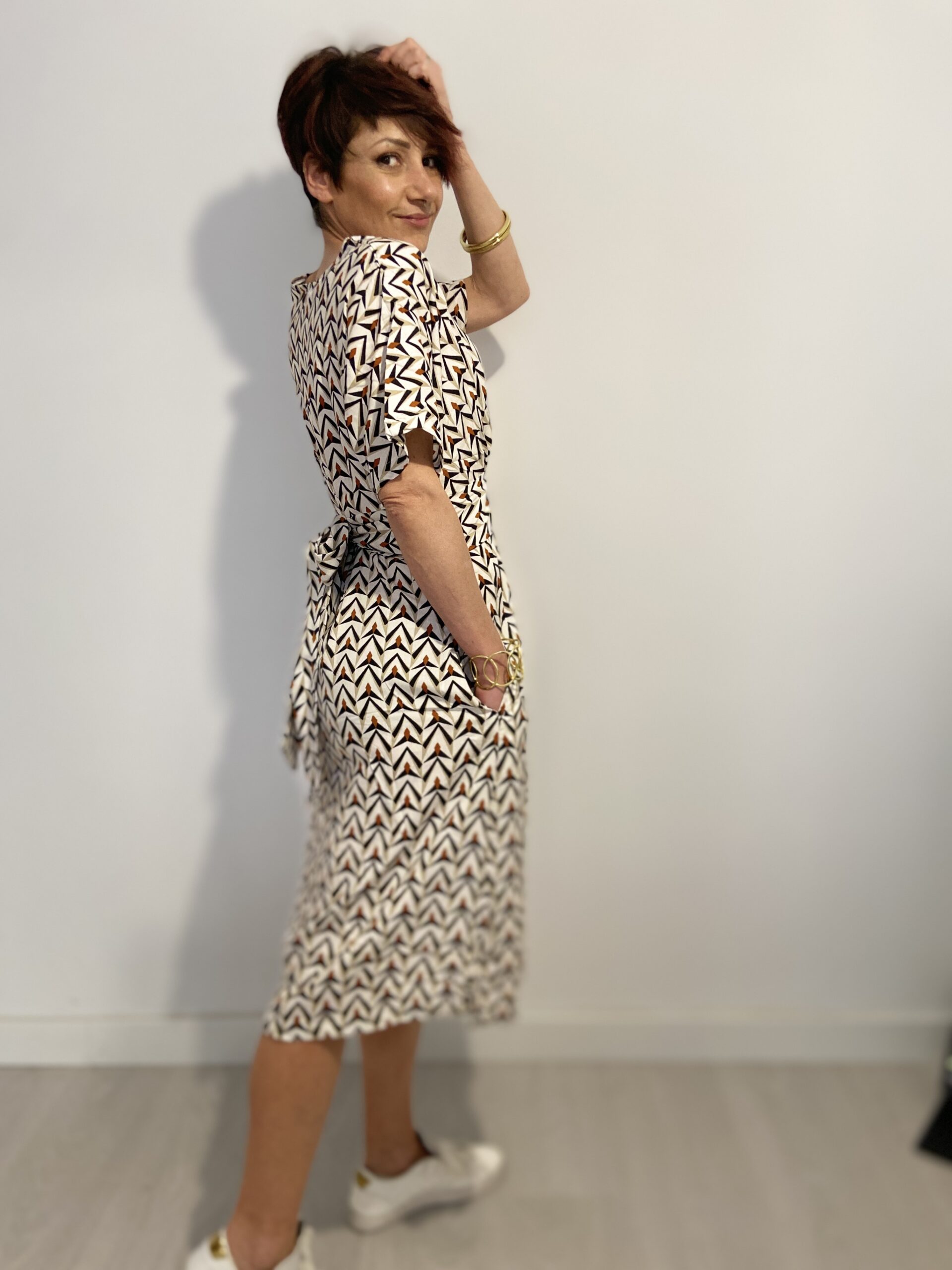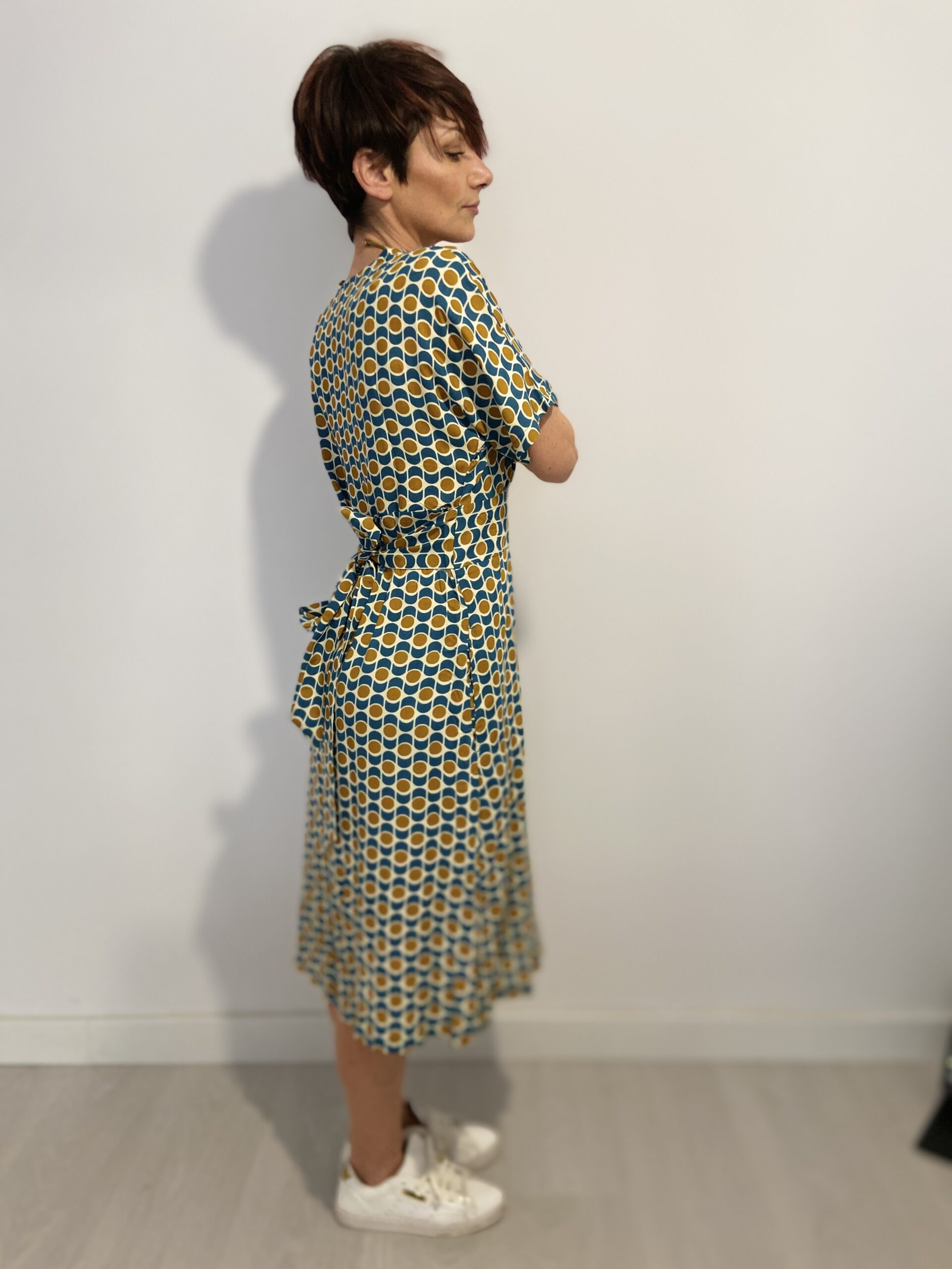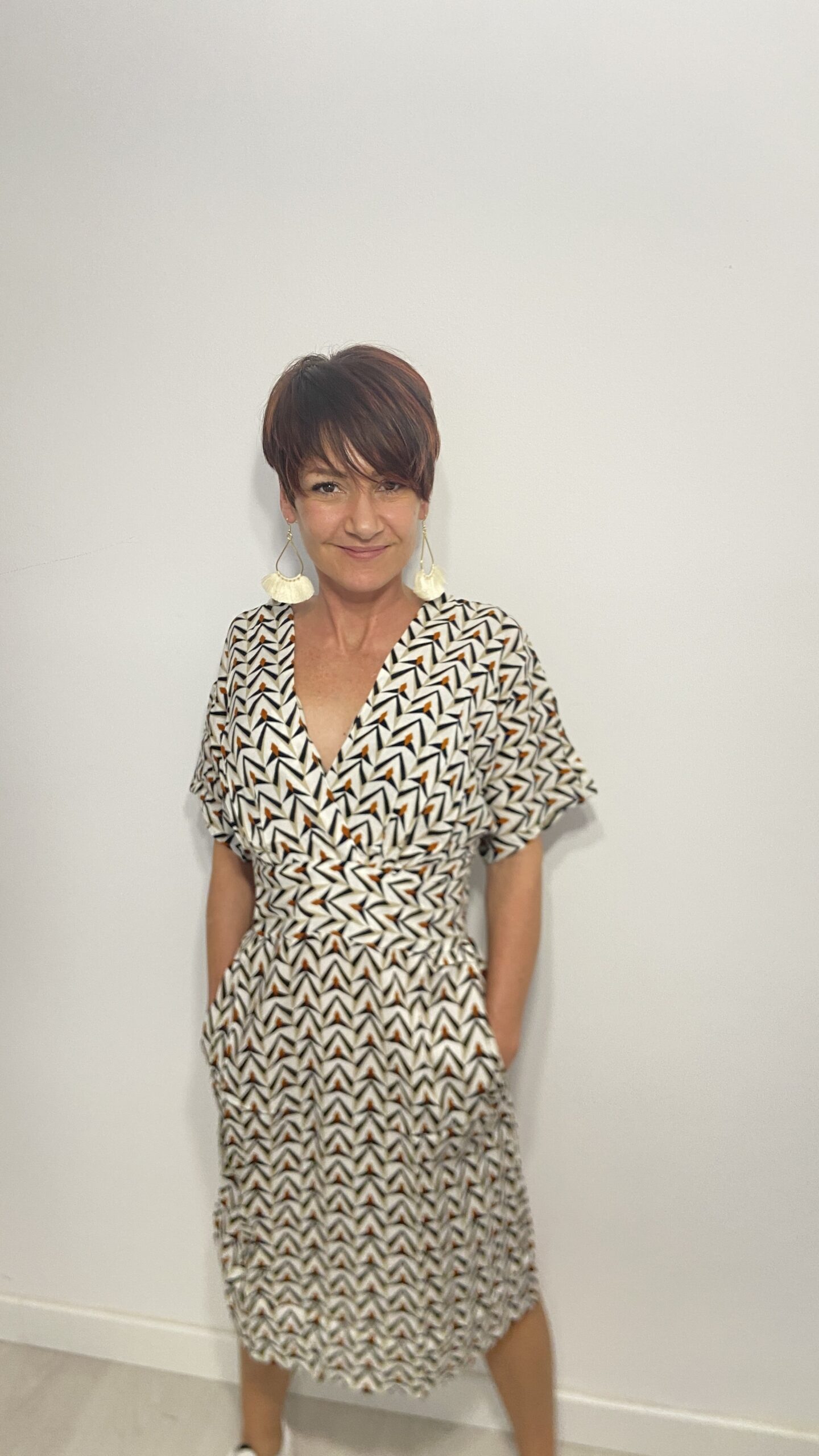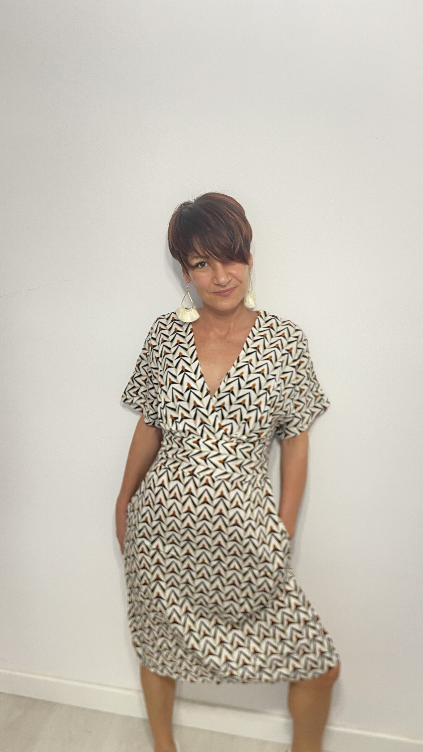 Un vestido de inspiración bohemia con un diseño envolvente, manga amplia y lazo ajustable en la espalda. Hecho de 100% rayón, es ligero, cómodo y perfecto para cualquier ocasión.