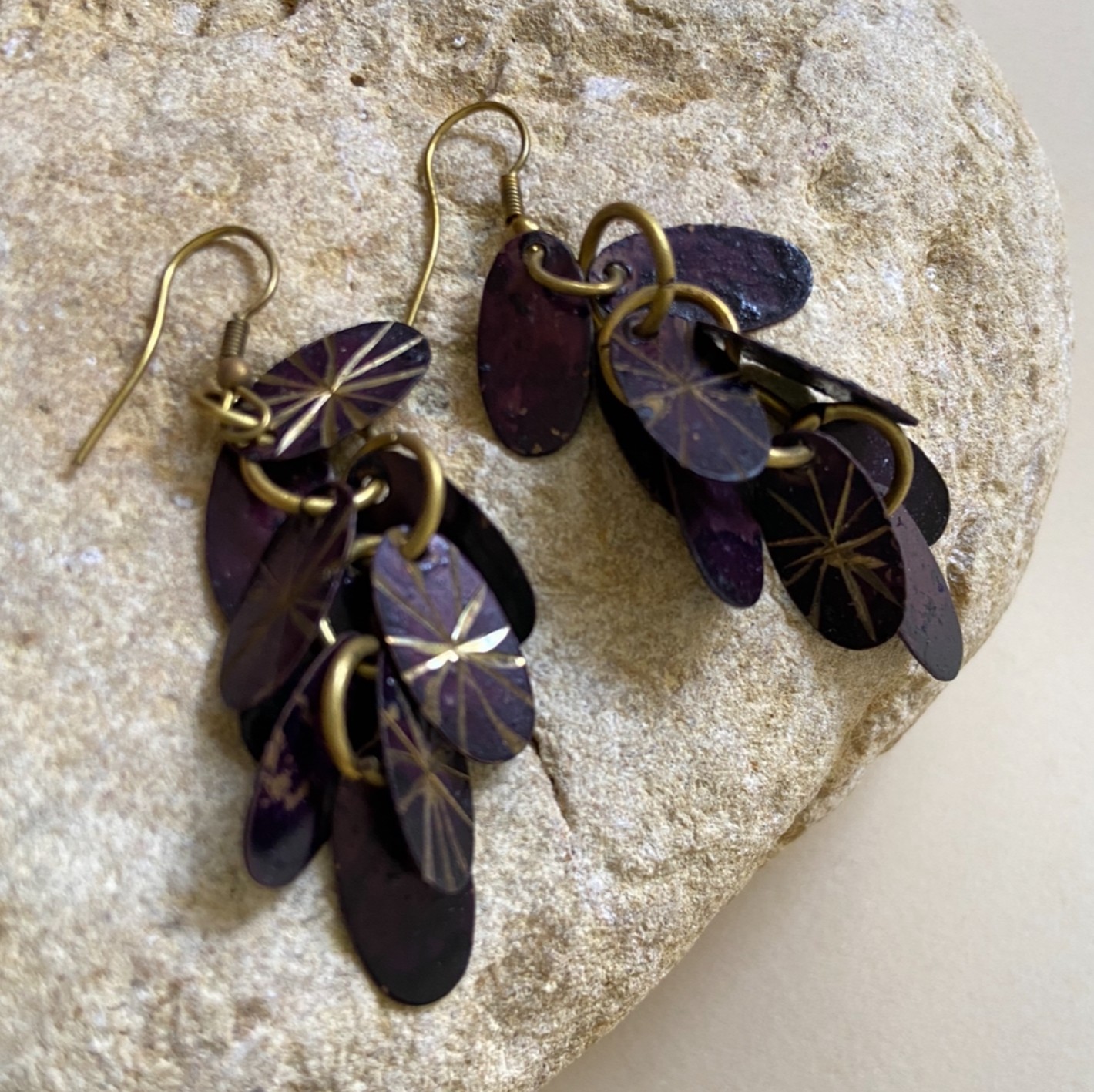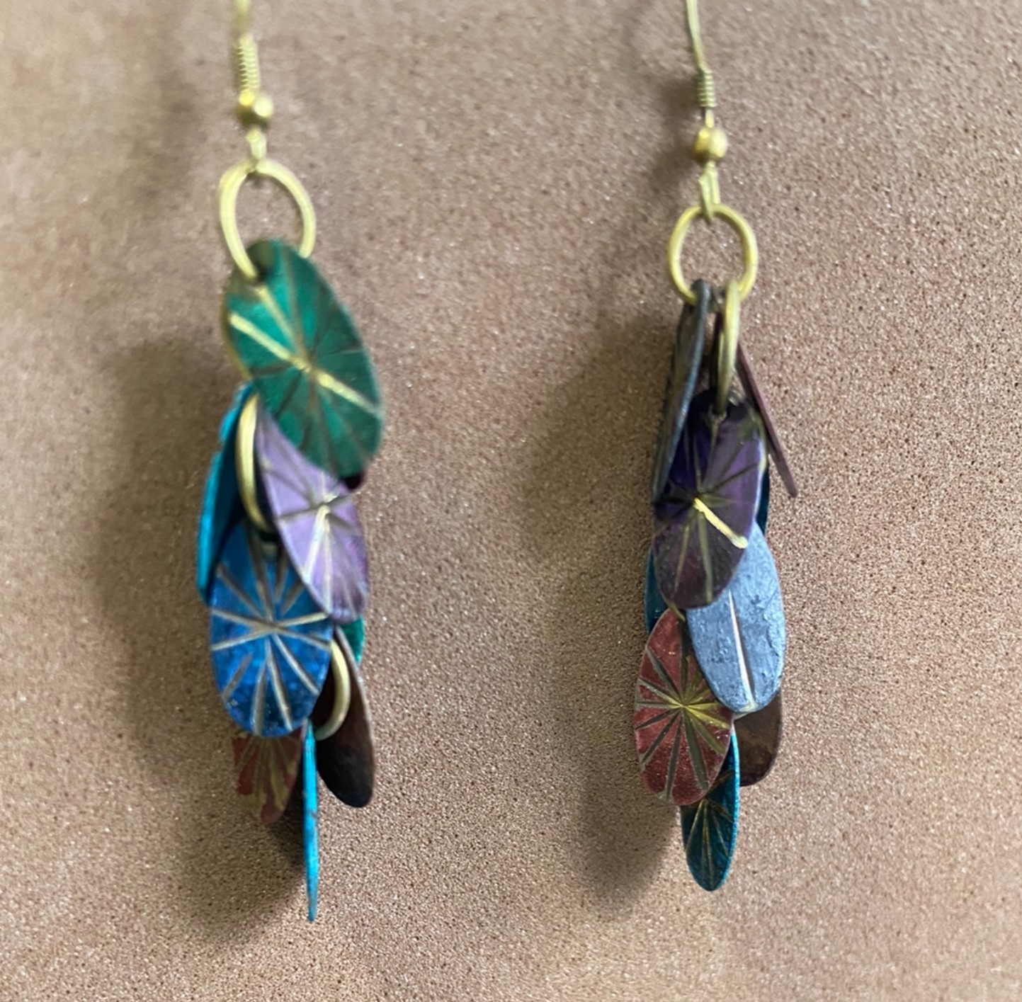 Estos pendientes de la línea ORIENTE presentan una cascada de colgantes ovalados en metal de color con forma de hojas, creando un efecto ligero y natural.