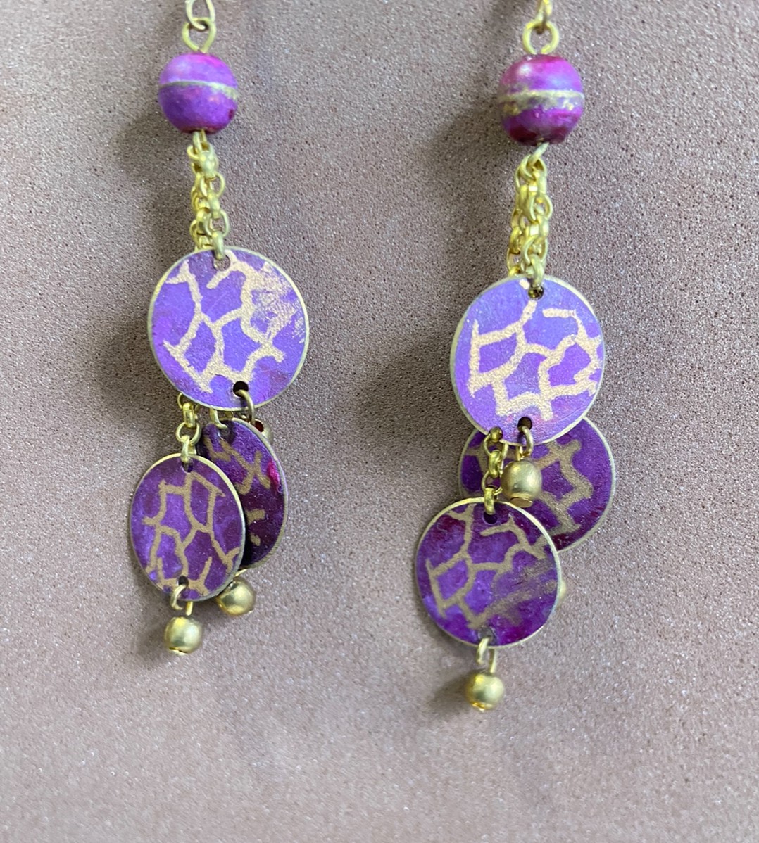 Pendientes de la línea ORIENTE, con tres dijes circulares conectados por cadenitas doradas y decorados con elegantes motivos dorados.
