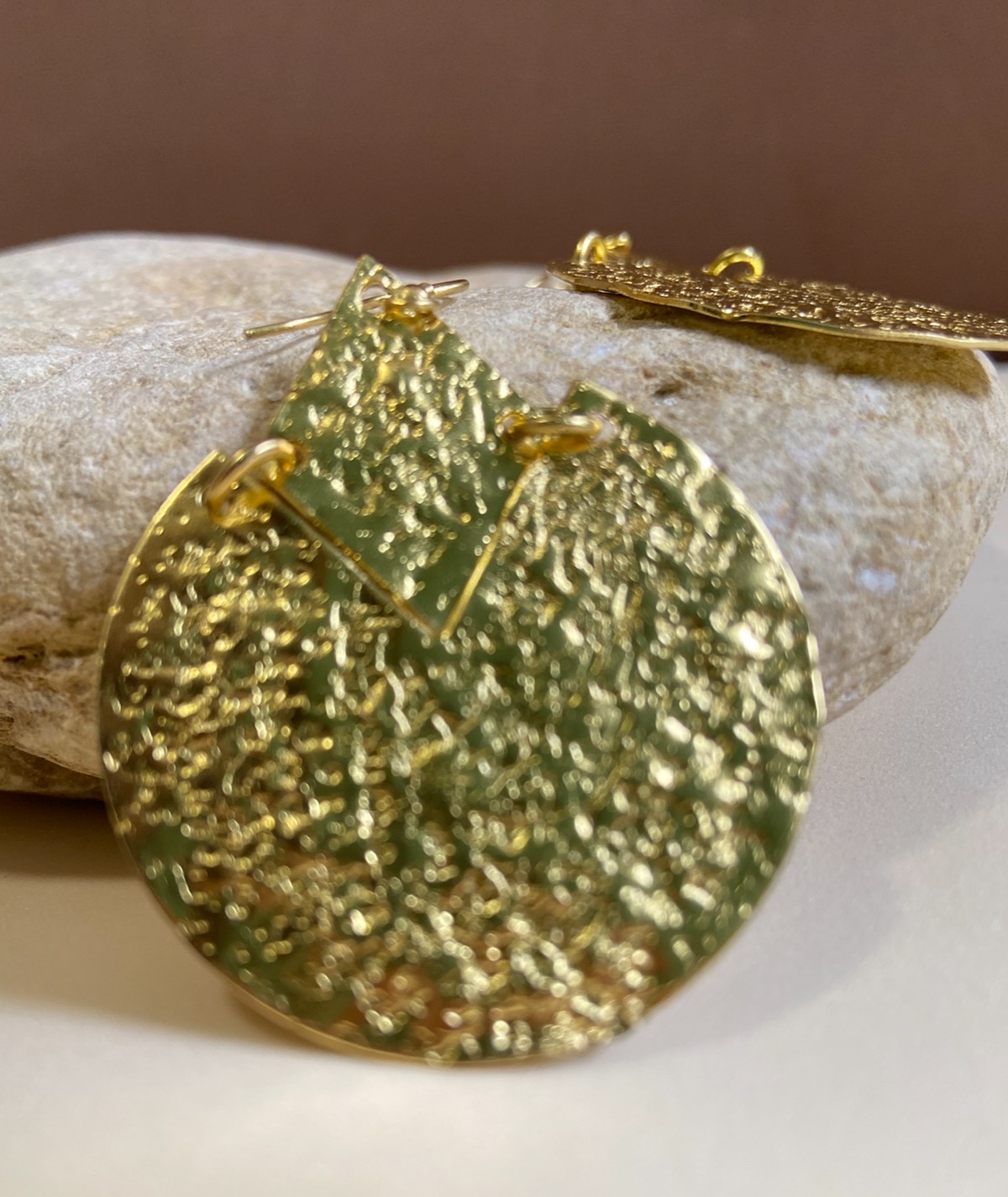 Estos pendientes artesanales están hechos de metal martillado y cuentan con un diseño original compuesto por un disco circular complementado por un rombo superpuesto, ambos en metal trabajado a mano para lograr un efecto único.