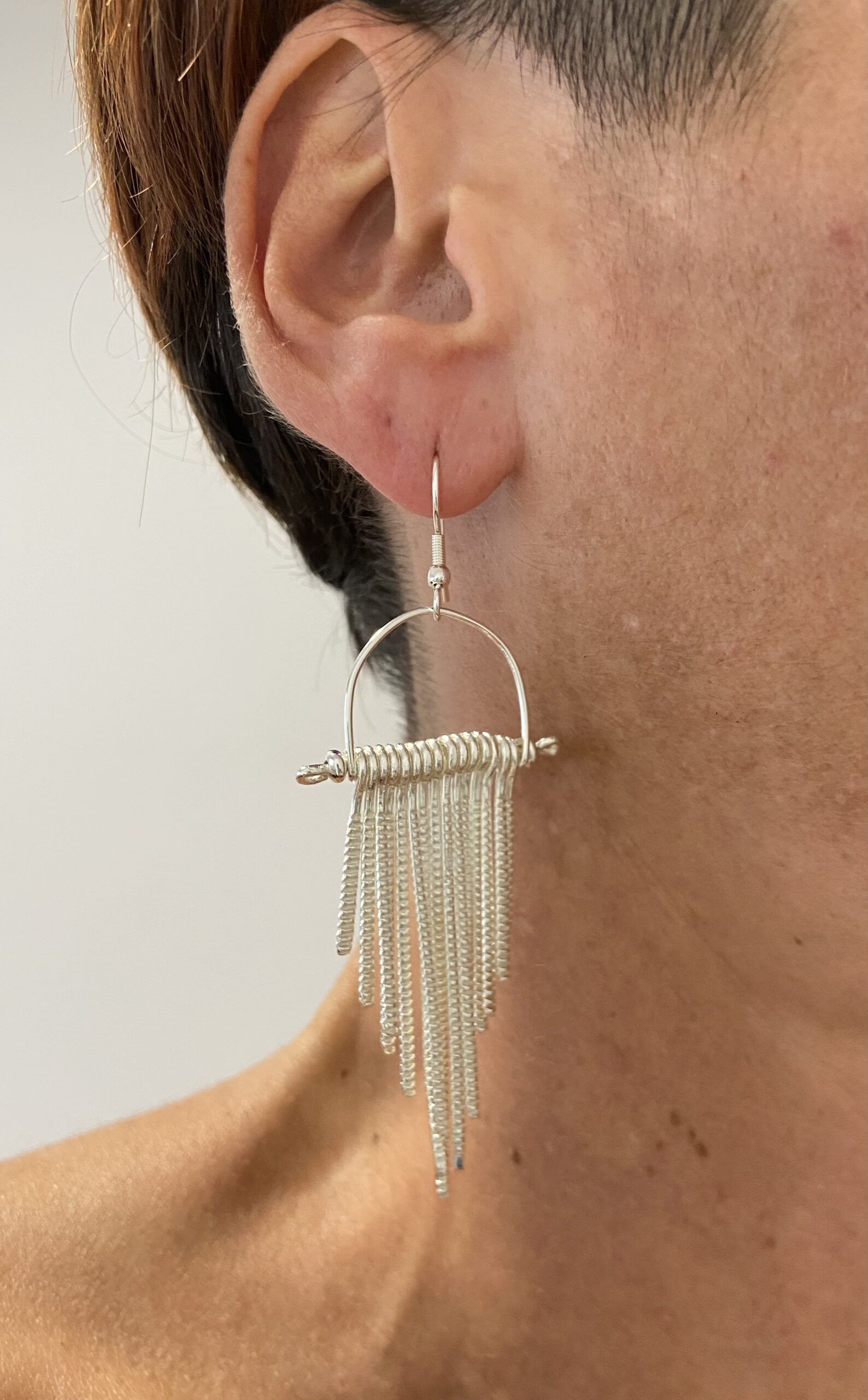 Estos pendientes colgantes están formados por 15 hileras de metal estriado que crean un efecto oscilante y lleno de movimiento.