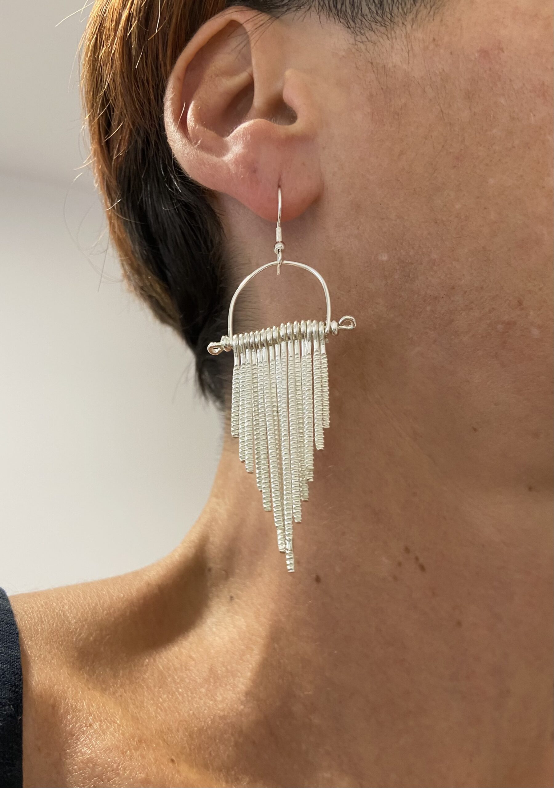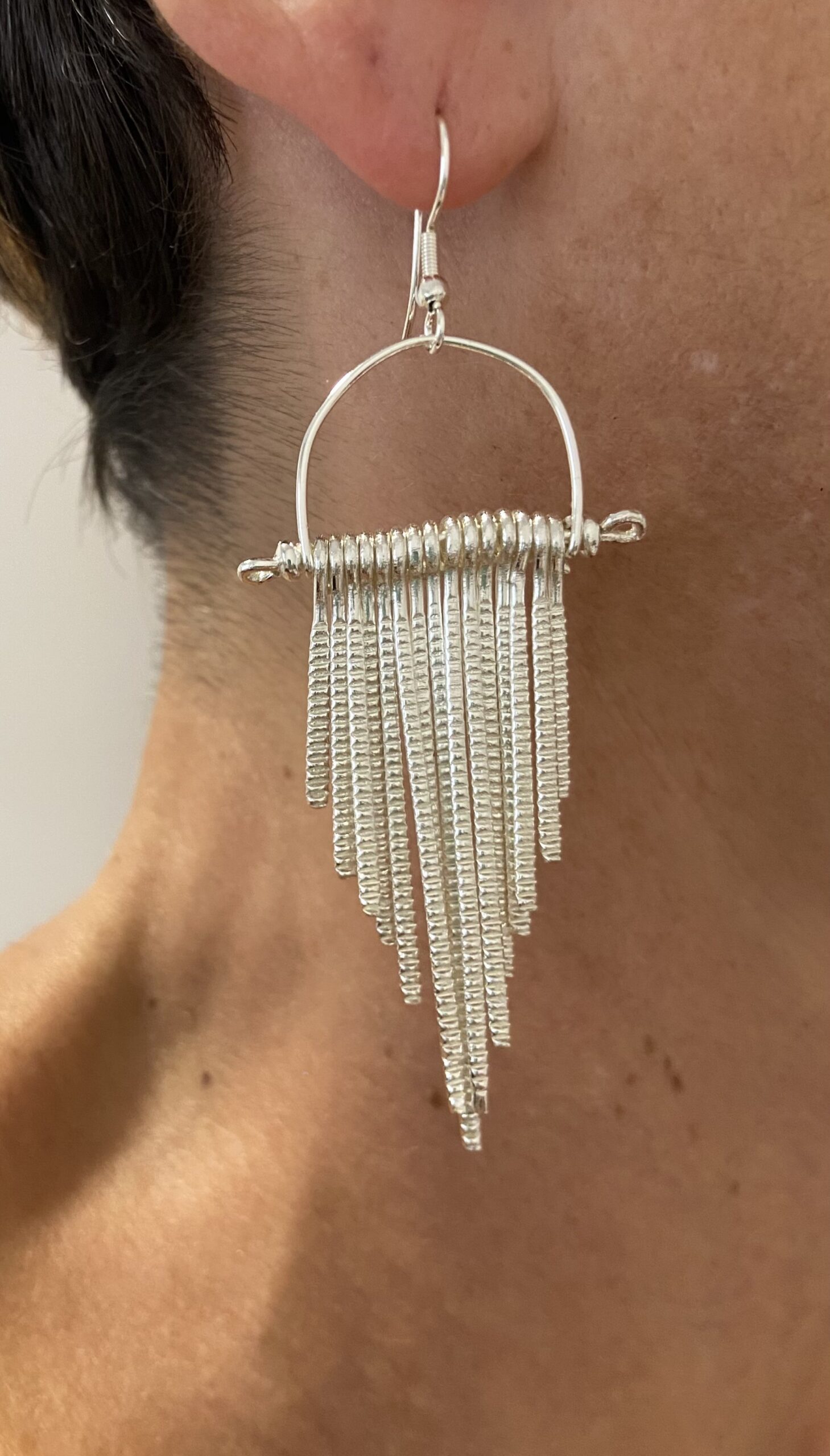 Pendientes colgantes con 15 hileras de metal estriado, disponibles en baño de plata y en color oro.