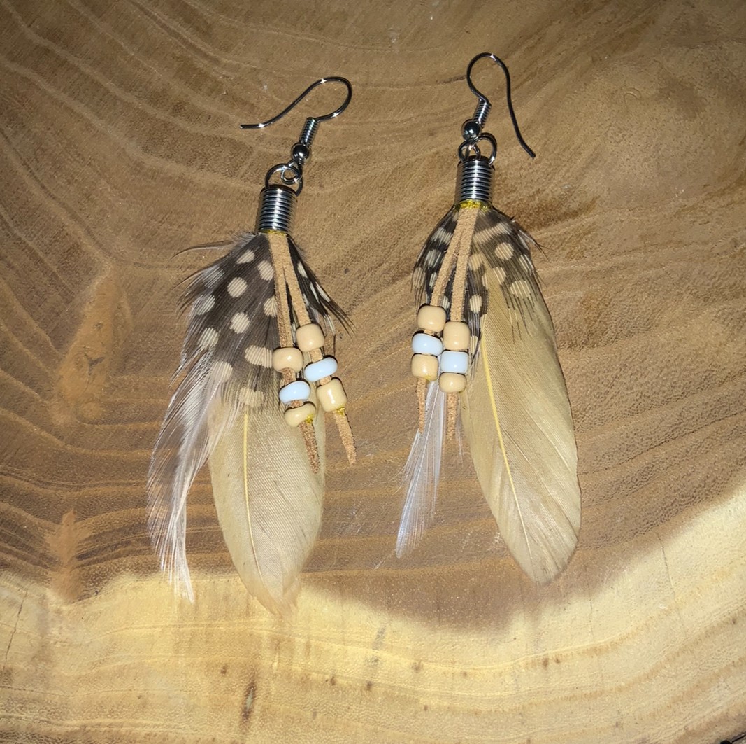 Elegantes pendientes colgantes con pluma beige y dos hileras de cuentas en paleta de colores.