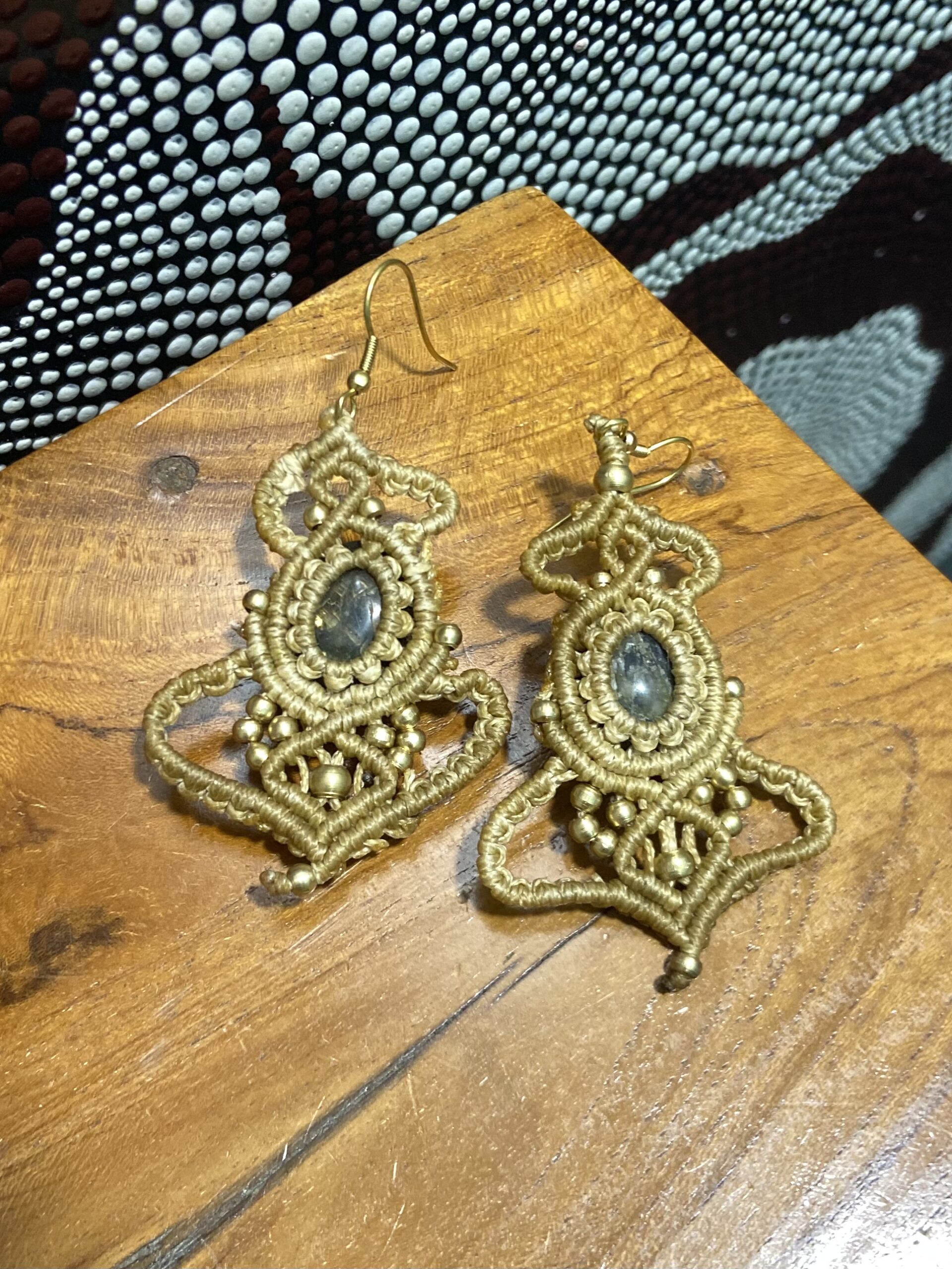 Cada par está elaborado a mano en India, con una cuidada técnica de macramé que abraza una piedra central ovalada (1,5×1 cm), decorada con pequeñas cuentas doradas que combinan con el gancho en latón.