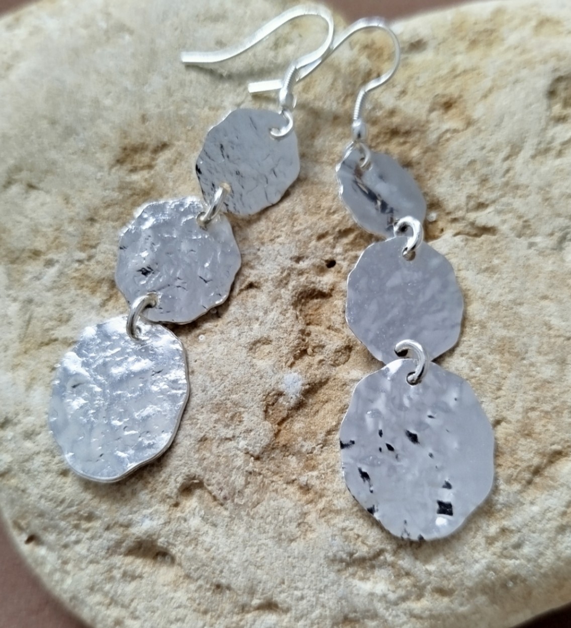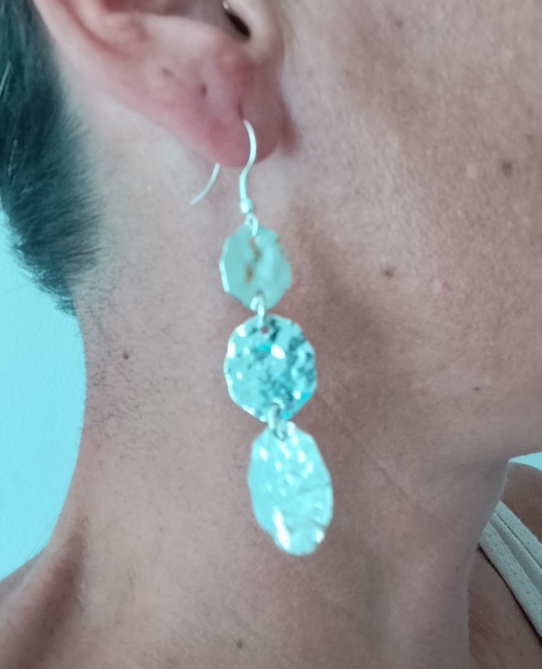 Pendientes colgantes con tres dijes ovalados, del más pequeño al más grande, de metal arrugado.