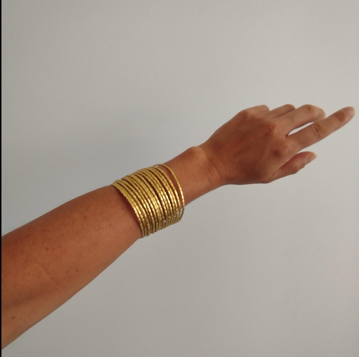 Elegante pulsera color oro compuesta por 16 círculos metálicos trabajados con grabados particulares, ajustable para adaptarse a cualquier muñeca.