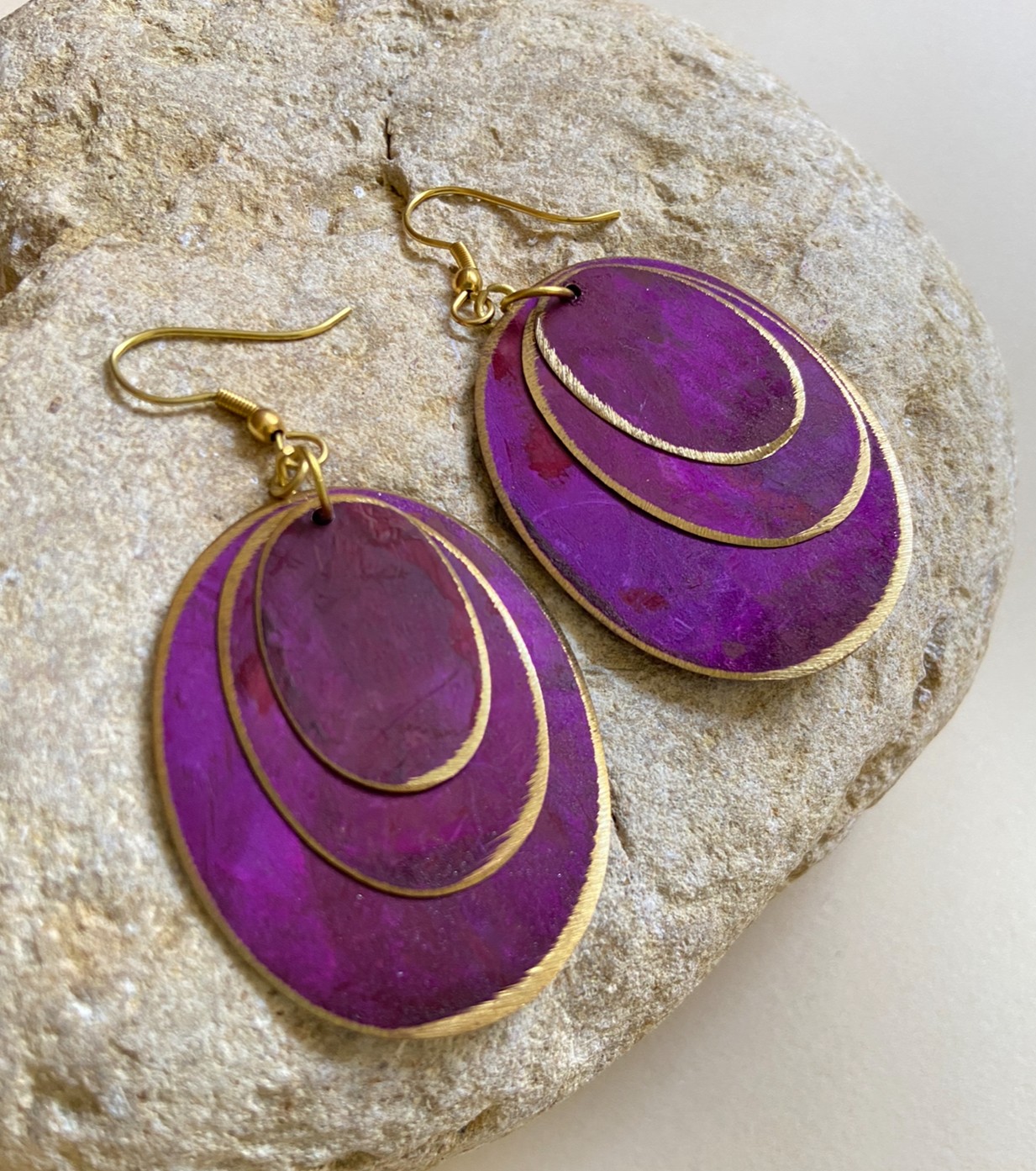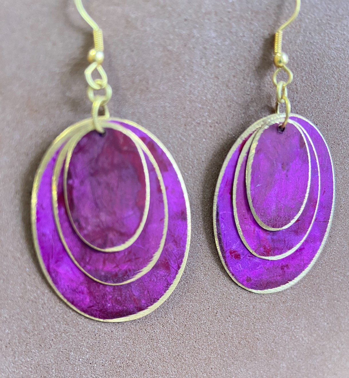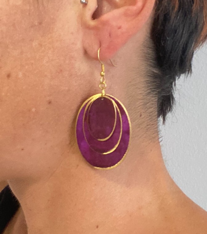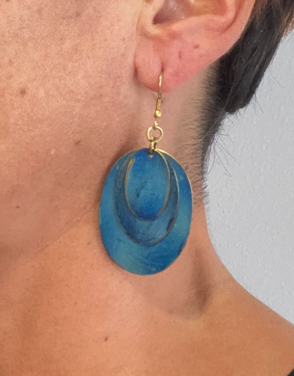 Estos elegantes pendientes colgantes de la colección ORIENTE presentan un diseño único con tres óvalos superpuestos en colores combinados, dispuestos del más grande al más pequeño para un efecto armónico y refinado.