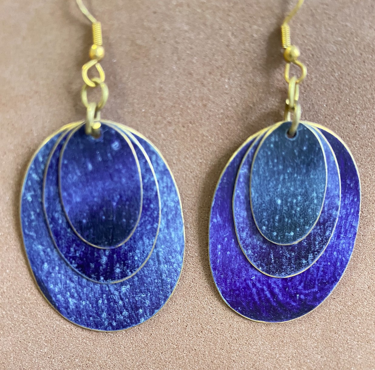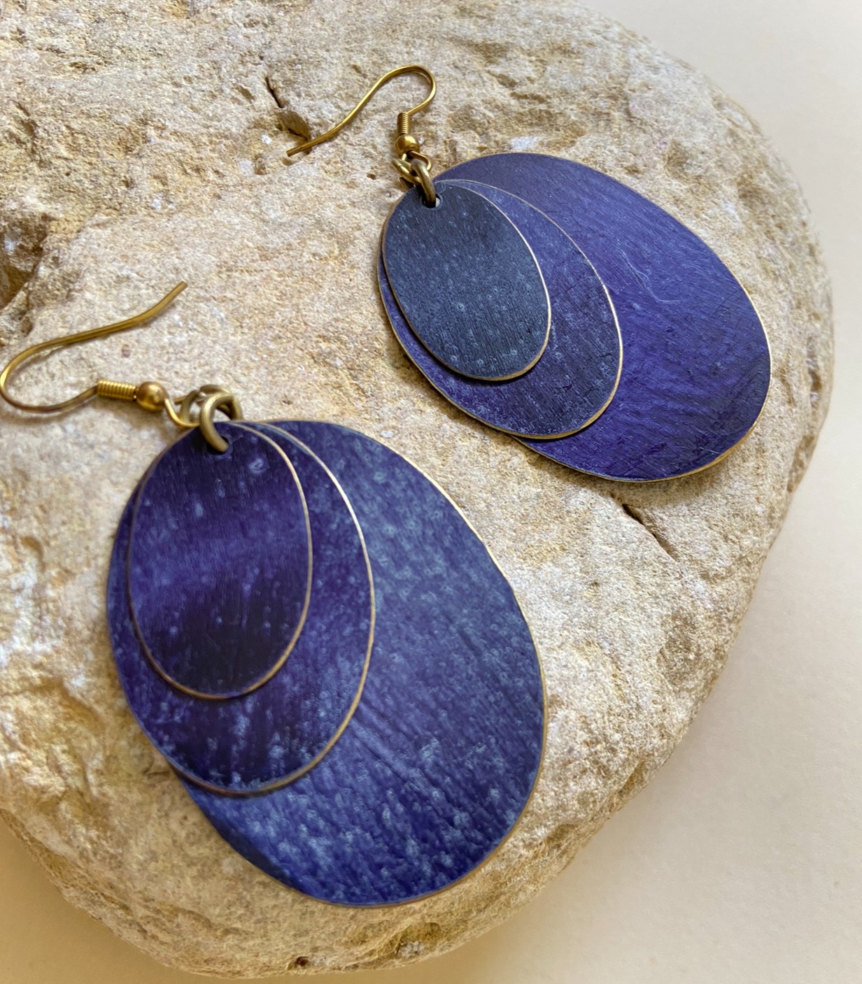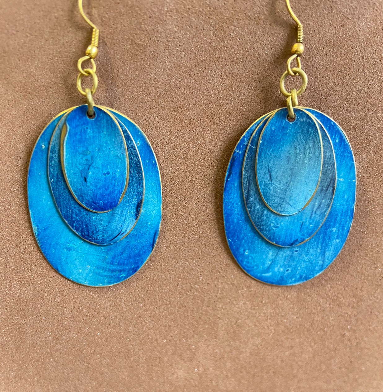 Estos elegantes pendientes colgantes de la colección ORIENTE presentan un diseño único con tres óvalos superpuestos en colores combinados, dispuestos del más grande al más pequeño para un efecto armónico y refinado.