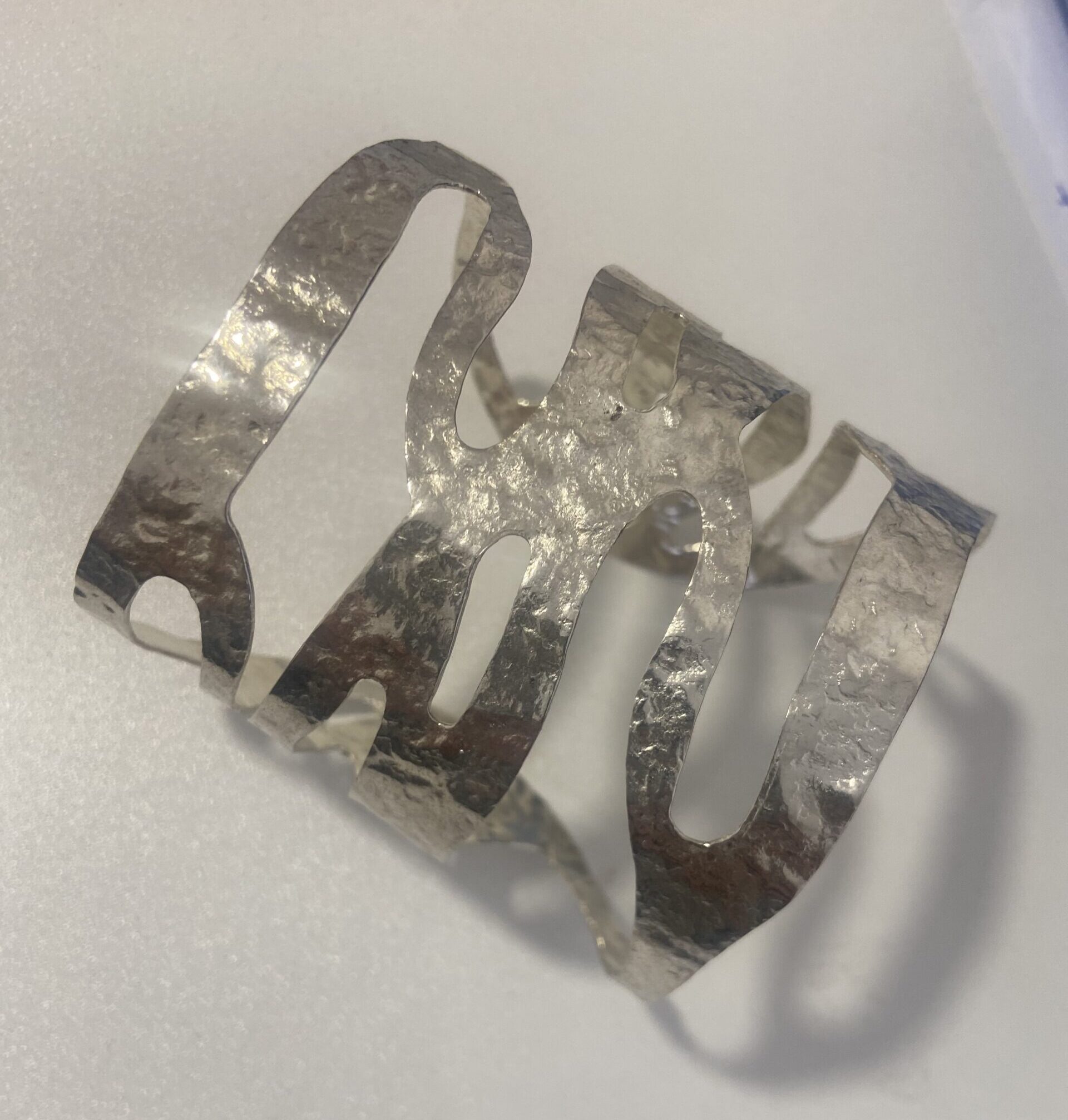 Brazalete artesanal de metal en baño de plata con diseño abierto y formas onduladas. Hecho a mano en India. Ajustable y elegante.
