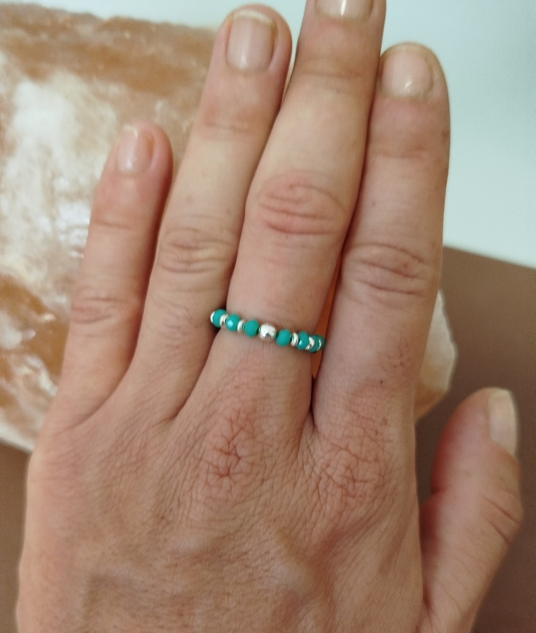 Anillos elásticos con cuentas de colores, disponibles en rojo, negro, blanco, gris, azul claro, turquesa y verde, fabricados a mano por artesanos locales en India.