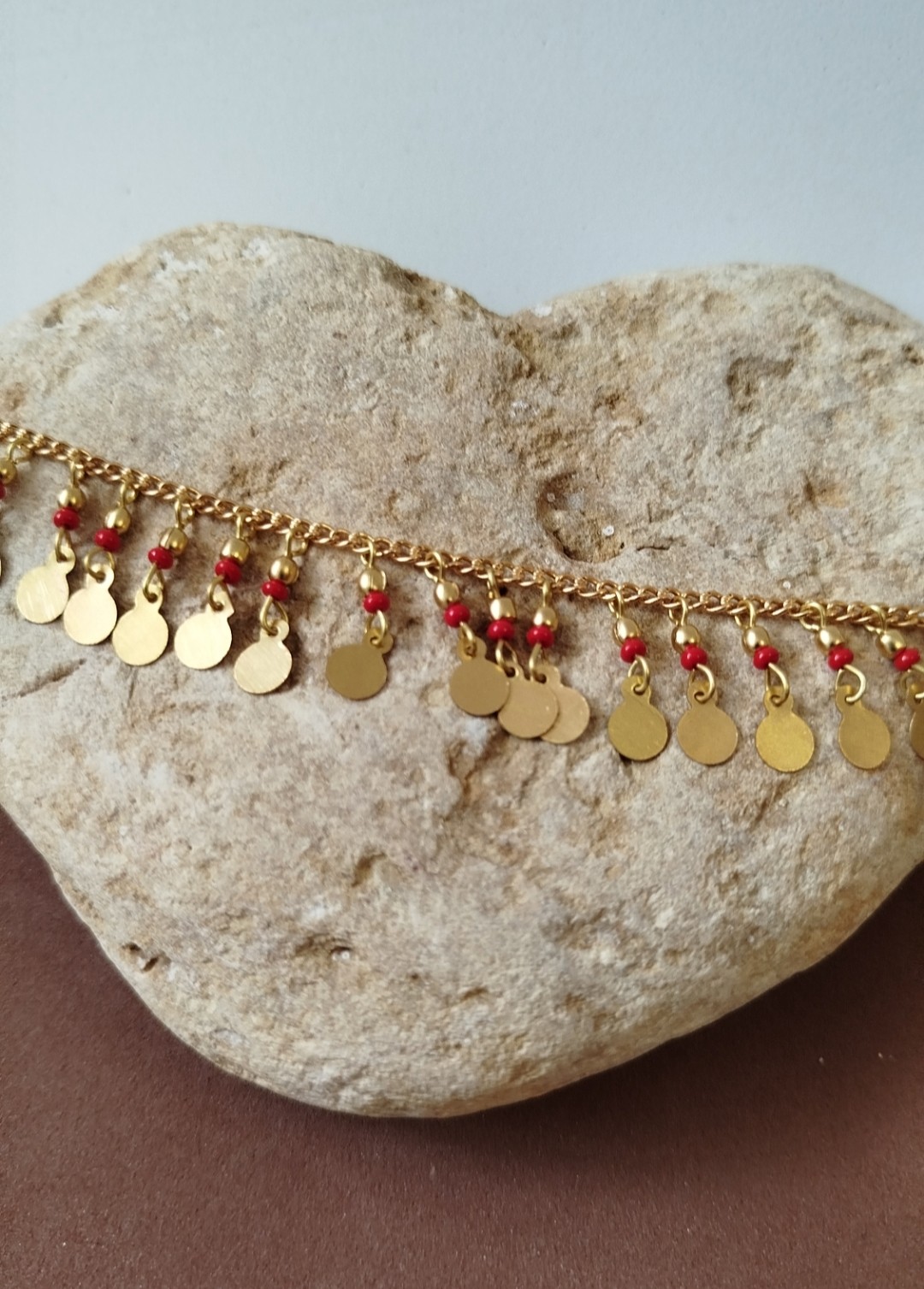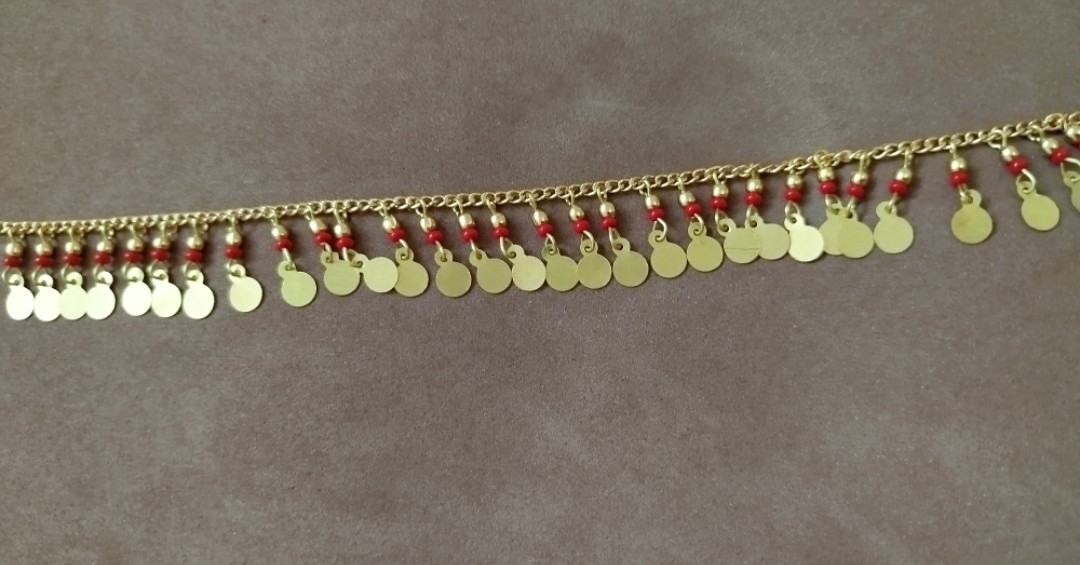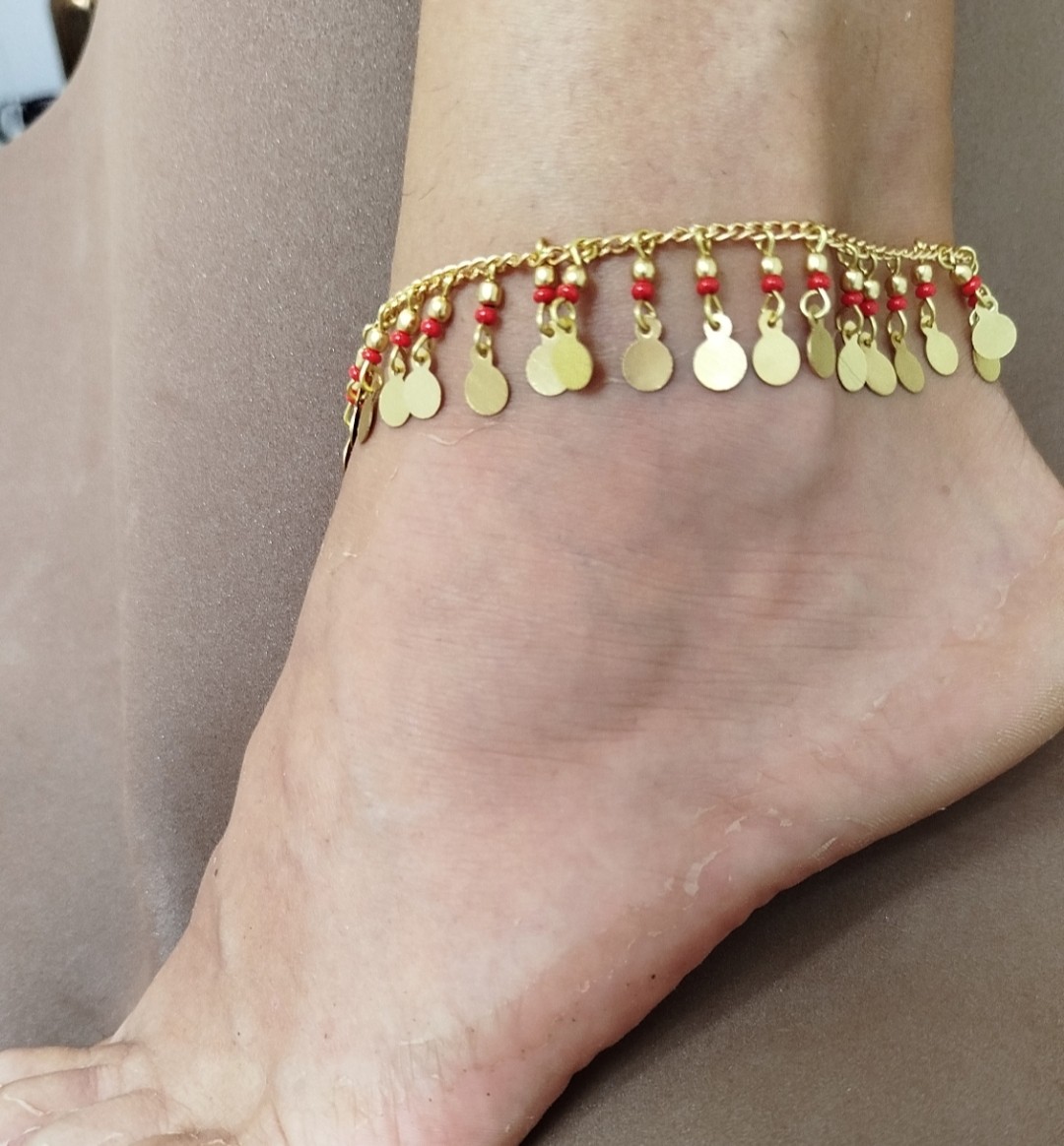 Tobillera artesanal con cuentas disponibles en rojo, negro o turquesa y medallitas redondas doradas.