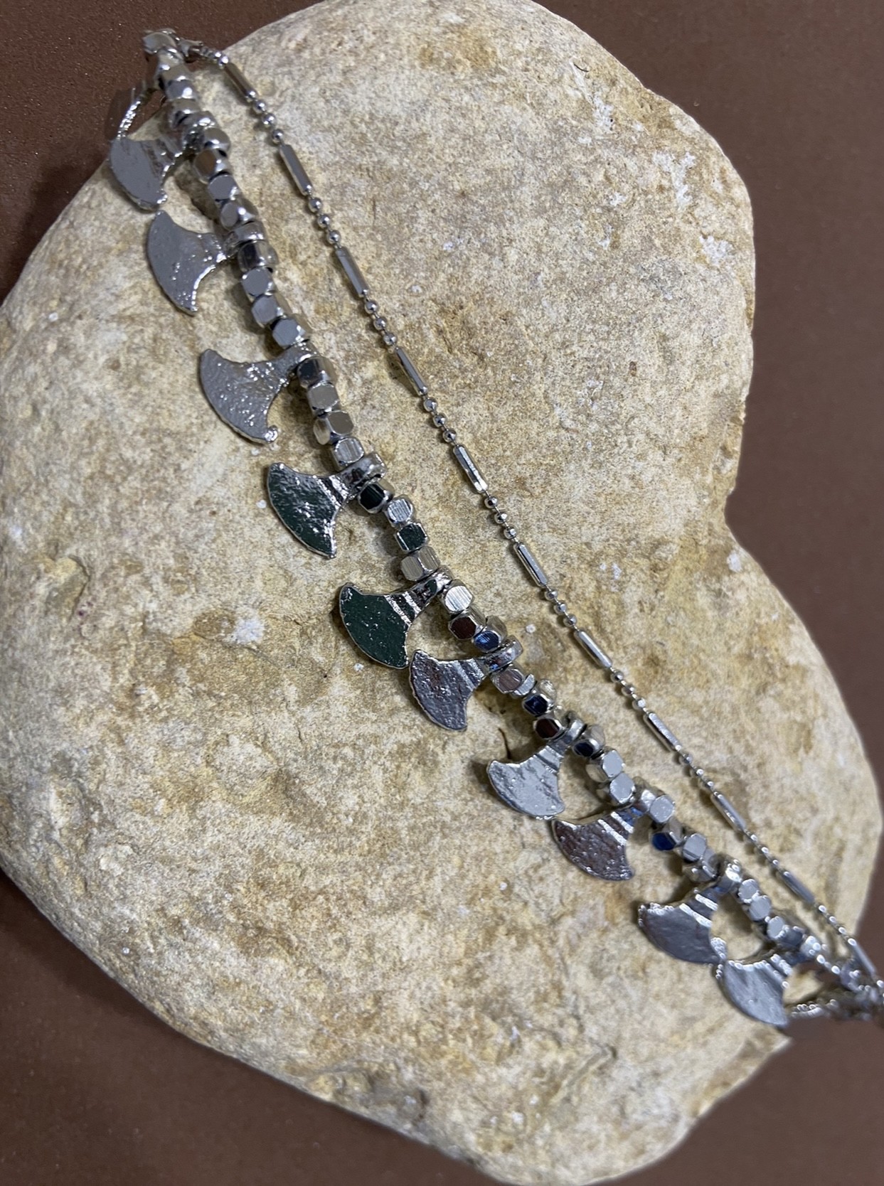 Esta pulsera cuenta con un gancho ajustable y presenta un doble hilo: uno simple y fino con cuentas en baño de platay otro adornado con colgantes en forma de hacha, también en baño de plata.