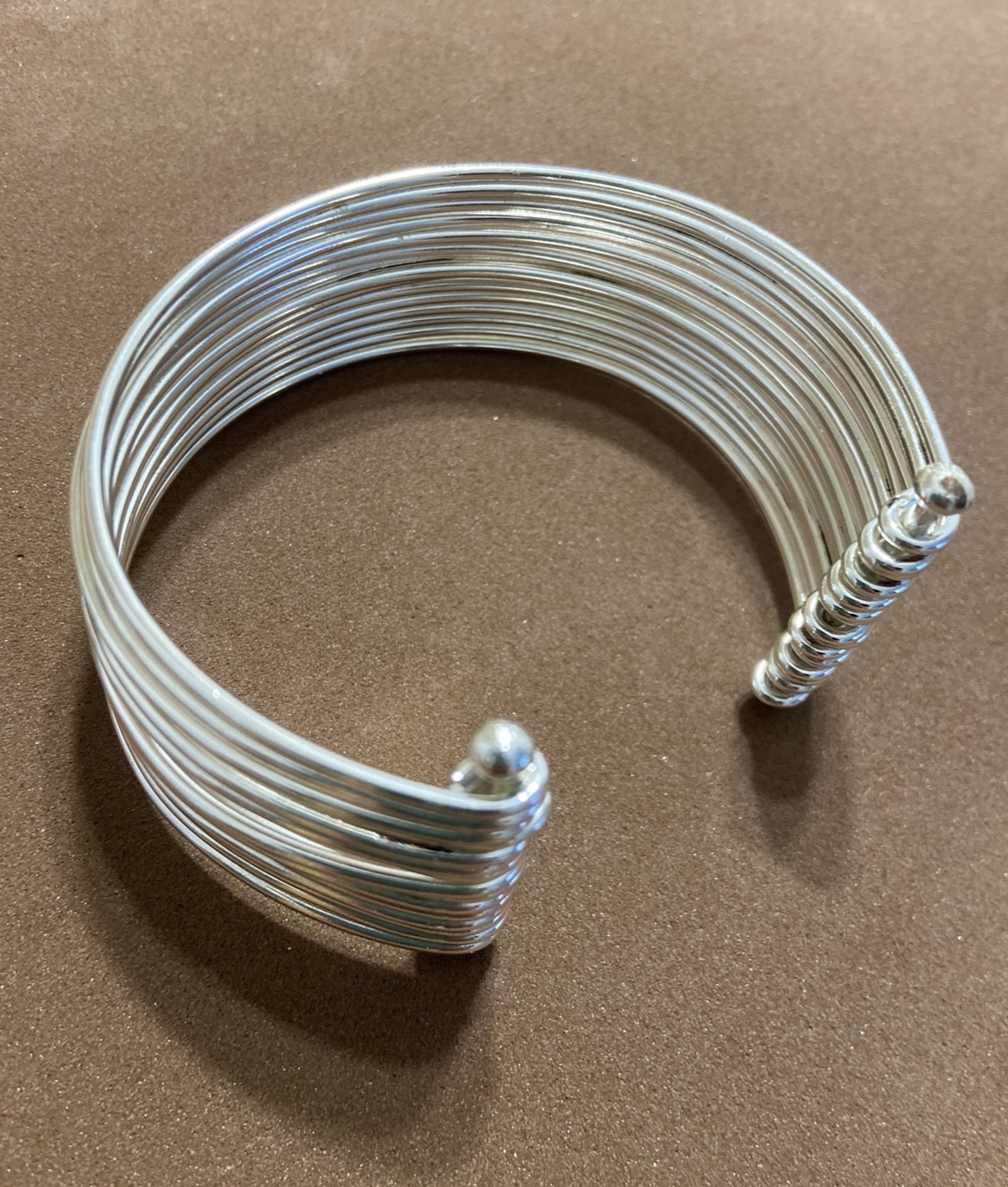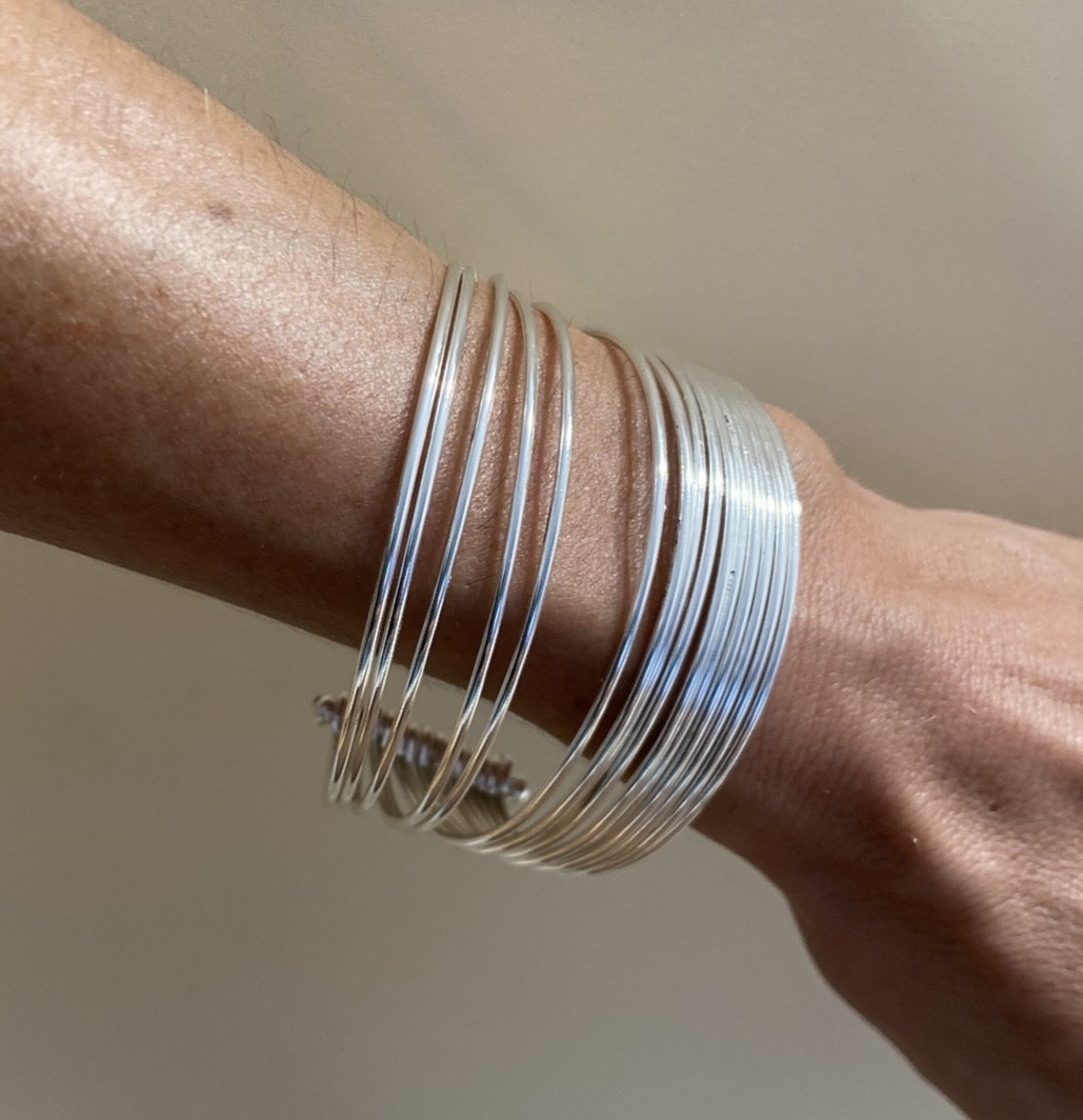 Pulsera rígida abierta atrás, composta da 15 hilos rígidos en baño de plata. Hecho a mano en India.
