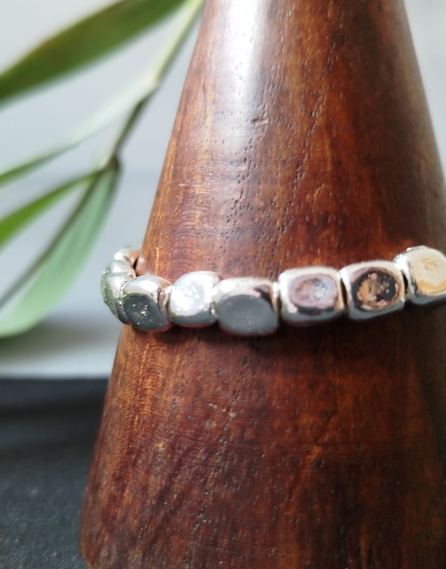 Esta pulsera elástica está hecha con perlas en forma de cubo irregular en baño de plata, ofreciendo un diseño único y contemporáneo.