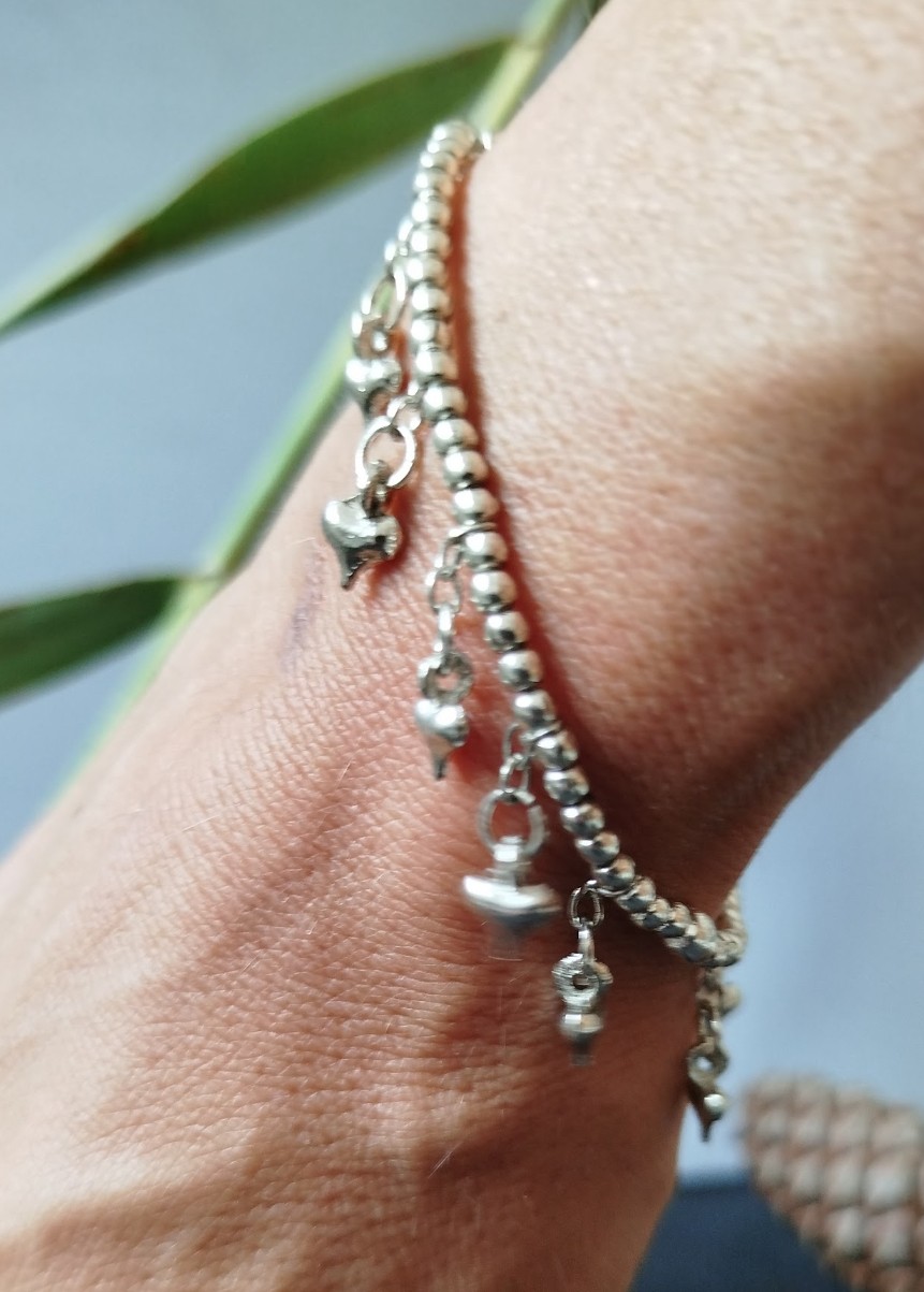 Esta pulsera elástica está hecha con perlas en baño de plata e incluye encantadores ciondoles colgantes en forma de corazón, creando un diseño romántico y moderno. Su elasticidad permite llevarla cómodamente durante todo el día, convirtiéndola en un accesorio versátil para cualquier ocasión. Los ciondoles en forma de corazón añaden un toque afectuoso y distintivo, haciendo de esta pulsera una elección ideal tanto para looks casuales como para eventos especiales. El acabado en baño de plata proporciona luminosidad y sofisticación, convirtiendo esta pulsera en una opción perfecta también como regalo para quienes aman la joyería elegante y romántica.