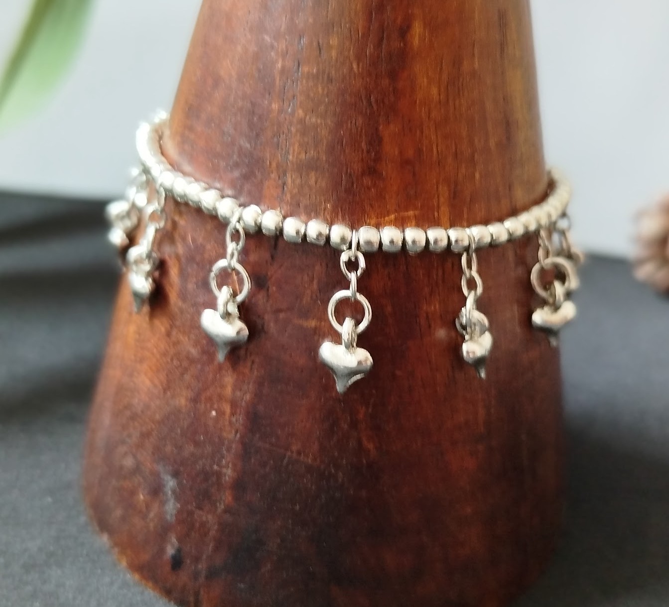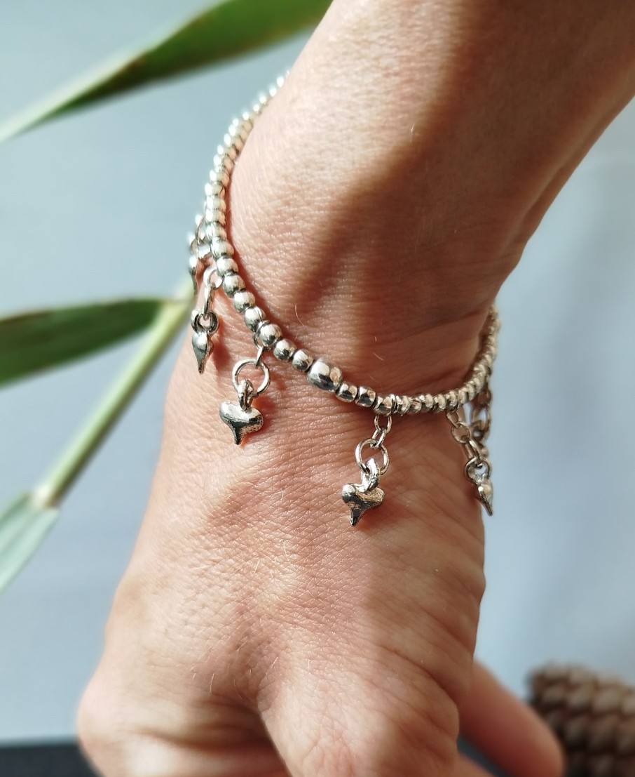 Pulsera elástica elegante con perlas en baño de plata y ciondoles colgantes en forma de corazón, perfecta para añadir un toque romántico y refinado.