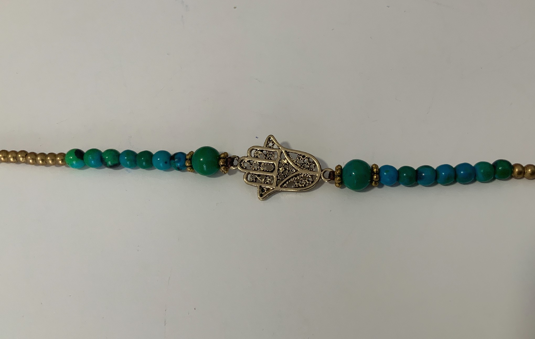 Descubre nuestras pulseras artesanales tailandesas, compuestas de perlas turquesa con un colgante Mano de Fátima de 1,5 cm. Disponibles en varias piedras de colores con cierre ajustable.”
