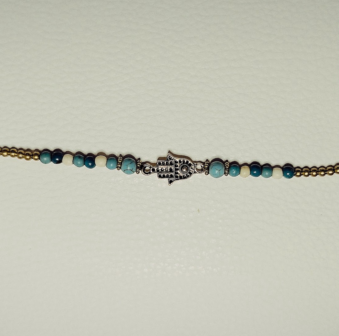 Descubre nuestras pulseras artesanales tailandesas, compuestas de perlas turquesa y blanco con un colgante Mano de Fátima de 1 cm. Disponibles en varias piedras de colores con cierre ajustable.”