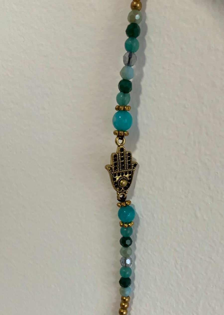 Descubre nuestras pulseras artesanales tailandesas, compuestas de perlas turquesa y azul claro con un colgante Mano de Fátima de 1 cm. Disponibles en varias piedras de colores con cierre ajustable.”