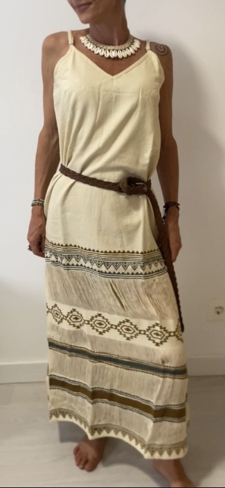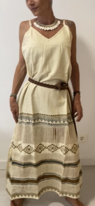 El Vestido Raíz Étnica combina frescura y elegancia con un diseño bohemio y artesanal. Hecho en algodón 100%, ofrece un corte largo y fluido con tirantes finos regulables y un escote en V favorecedor.